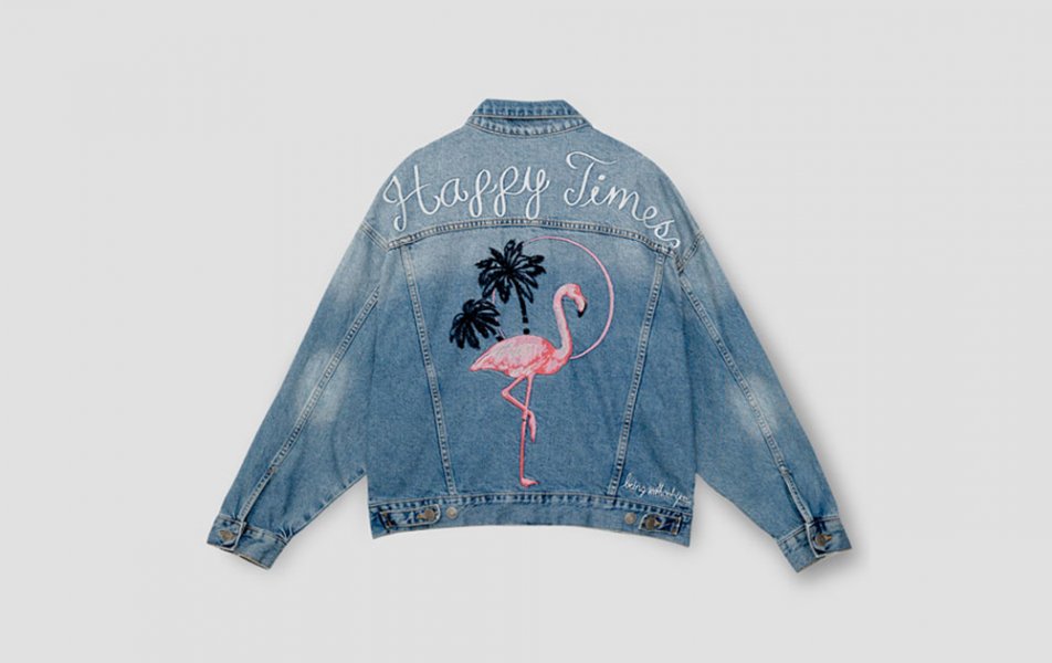 ผ้ายีนส์ก็เป็นอีกสไตล์ที่แมทช์กับอะไรก็รอด แต่ถ้าเป็นแจ็กเกตยีนส์เพลนๆ เรียบๆ ก็คงจะดูไม่น่าสนใจ ดีไม่ดีจะซ้ำกับคนอื่นอีก เราเลยเลือก Flamingo Denim Jacket ของ Pull & Bear แบรนด์เสื้อผ้าวัยรุ่นจากสเปนมาฝากกัน ด้านหน้ามีกระป๋าตรงหน้าอก 2 ข้าง และกระดุมเหล็กผ่ากลาง ส่วนด้านหลังปักเป็นลายฟลามิงโกสีชมพูสดใสกับต้นมะพร้าวม พร้อมคำว่า Happy Times ด้านบน ถ้าเป็นสาวเท่แอบซ่อนความหวาน ต้องตัวนี้แหละเหมาะ