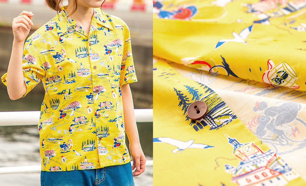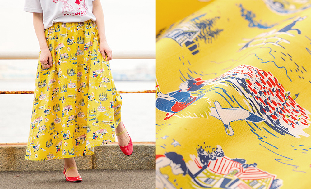 ลายที่สองโทนดาวน์ความจัดจ้านลงมาหน่อย ด้วยพื้นสีเหลืองสบายตา กับลายกราฟิกสีแดงขาวน้ำเงิน สร้างคอมบิเนชันสีได้โดดเด่นดีจริง ๆ ซึ่งลวดลายที่ใช้ก็ลงตัวดีเหลือเกิน เพราะเป็นลาย Memories of Koriko หรือก็คือ Koriko ฉากหลังของเรื่อง Kiki's Delivery Service ผลงานปี 1989 นั่นเอง พอมาอยู่บนลายผ้าแบบนี้ แถมมีการลงรายละเอียดแม่หนูกิกิ เจ้าแมวเหมียวจีจี้ และหนุ่มน้อยทอมโบะ ก็ยิ่งทำให้เหมือนตัวละครเหล่านี้จับต้องได้ขึ้นมาสำหรับแฟน ๆ อย่างเรา