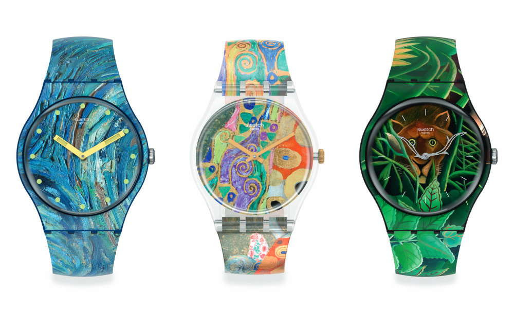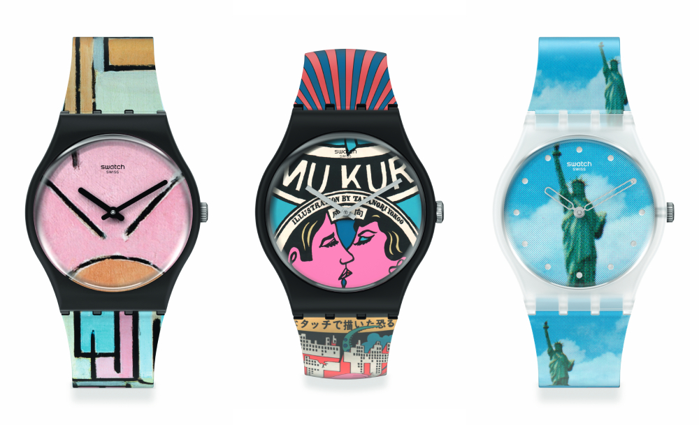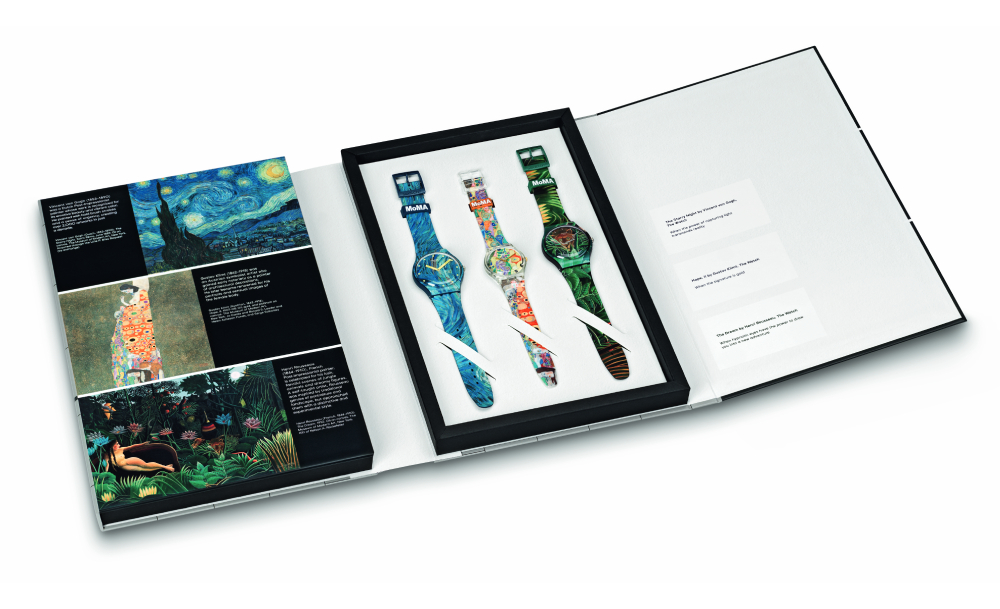 คอลเลกชัน Swatch x MoMA ประกอบด้วยดีไซน์จากภาพ The Starry Night ปี 1889 ของ Vincent van Gogh ภาพ Hope, II ปี 1907-1908 ของ Gustav Klimt ภาพ The Dream ปี 1910 ของ Henri Rousseau ภาพ Composition in Oval with Color Planes 1 ปี 1914 ของ Piet Mondrian และคอมโบ 2 ภาพ 2 ดีไซน์นาฬิกา กับ The City and Design, The Wonders of Life on Earth ปี 1966 และ New York ปี 1968 ของศิลปิน Isamu Kurita