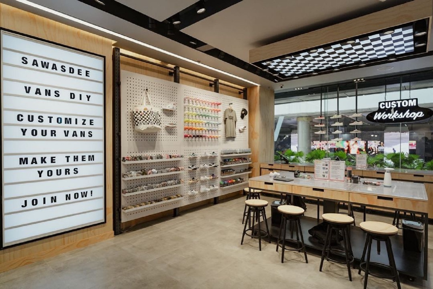 โซนนี้ถือเป็นไฮไลต์ของคอนเซปต์สโตร์แห่งนี้ที่เราชอบมาก ๆ เพราะเขาอุทิศพื้นที่เกือบครึ่งหนึ่งของชอปให้กับโต๊ะเวิร์กชอปขนาดยักษ์ที่ลูกค้าอย่างเราสามารถเดินไปหยิบอุปกรณ์พวกแพตช์ผ้า หมุดเหล็ก ไปจนถึงบล็อกสติกเกอร์และปากกาเพนต์ผ้า มาลงมือสร้างสรรค์ศิลปะบนไอเทม Vans ได้เลย ซึ่งในจุด ๆ นี้ก็จะมีสตาฟคอยให้คำแนะนำเราตอกหมุดและรีดแพตช์ผ้ากันอย่างใกล้ชิด ใครที่ชอบทำงาน DIY จะต้องเลิฟโซนนี้มากแน่ ๆ