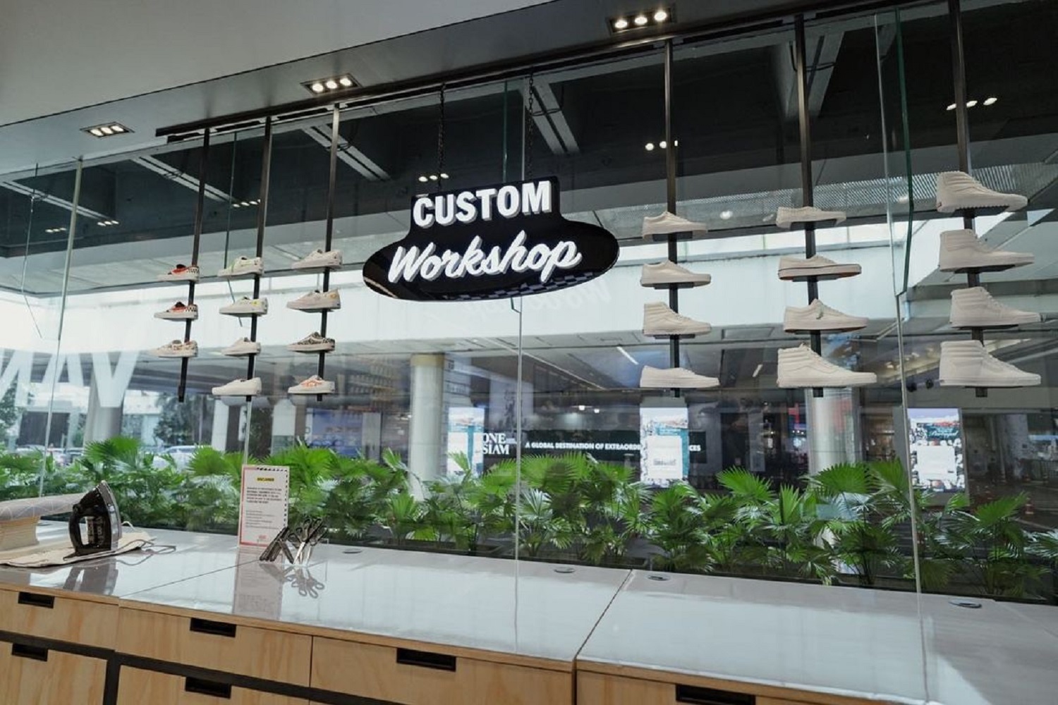 คอนเซปต์การคัสตอมถือเป็นจุดเด่นหลักของ New Vans Concept Store แห่งแรกและแห่งเดียวในเมืองไทย ซึ่งถูกใจสายครีเอทีฟอย่างเรามาก ๆ เพราะนอกจากเราจะได้ชอปปิงไอเทมรุ่นใหม่ล่าสุดและคอลเลกชันลิมิเต็ดต่าง ๆ แล้ว เรายังสามารถนำเสื้อ กระเป๋า กางเกง ไปจนถึงรองเท้าของ Vans (ซื้อจากชอปไหนก็ได้ แต่ต้องมีใบเสร็จ) มารังสรรค์ใหม่ในแบบฉบับของตัวที่กันที่โซน Customization Area