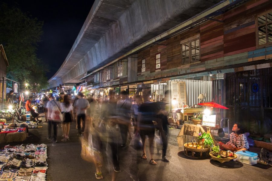 นอกจากจะใช้พื้นที่ใต้รางรถไฟสายสีม่วงให้เกิดประโยชน์แล้ว ที่นี่ยังเป็นแหล่งช็อปปิ้งในยามค่ำคืนที่ดีงามอีกแห่งหนึ่งเลยนะ คนที่มาต้องหลงรักบรรยากาศแบบย้อนยุคของที่นี่แน่ๆ ก็มีทั้งของสะสมโบราณ ร้านเสื้อผ้า ของตกแต่ง และร้านอาหาร ให้เดินเล่นกันได้ทุกเพศทุกวัยมีเสน่ห์มากๆ