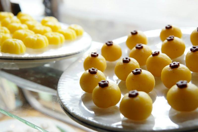 ตรงเคาน์เตอร์ที่มีต้นไม้ตกแต่งอย่างสวยงามและขนมไทยที่ทำสดใหม่ทุกวันวางเรียงรายอยู่ ซึ่งก็จะสลับสับเปลี่ยนหมุนเวียนไปเกือบทุกวันหรือทุกสัปดาห์ มีทั้งข้าวต้มมัด ขนมใส่ใส้ ขนมชั้น ทองหยิบ ทองหยอด ทองเอก ลูกชุบ ตะโก้ ขนมโสมนัส(คุกกี้โบราณ) และอย่างอื่นอีกมากมาย แถมขนมของทางร้านก็ไม่เน้นรสหวานโดด ทำให้ทานง่ายและไม่เลี่ยน