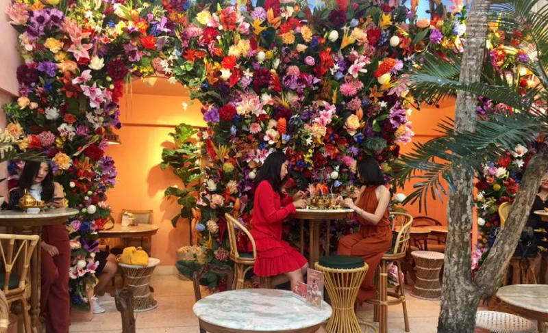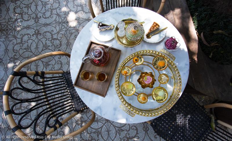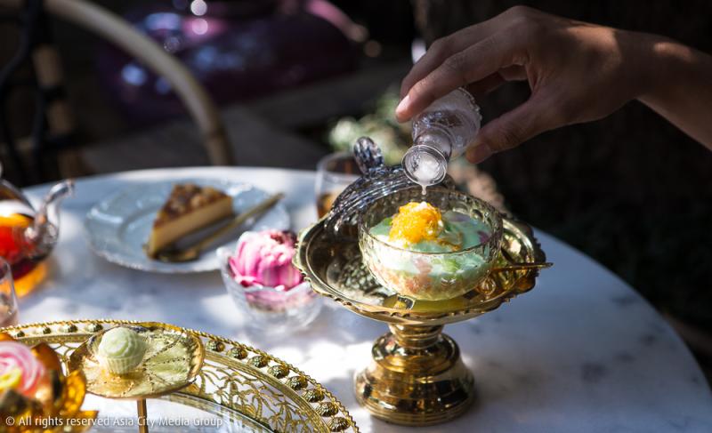 รวมถึงเมนูที่มีความครีเอทด้วยการนำขนมไทยมานำเสนอในรูปแบบของเค้ก อย่าง เค้กบัวลอยไข่หวาน เค้กลอดช่อง (150 บาท) ที่เหมาะมากหากจะทานกับชาร้อน ๆ ยามบ่าย อีกทั้งเมนูขนมก็ถูกเสิร์ฟมาในภาชนะสีทองเหลืองแบบไทย ๆ ให้ความสวยงาม ซึ่งเราว่าน่าจะถูกใจเหล่านักเซลฟีไม่ใช่น้อย อีกทั้งภายในร้านยังตกแต่งด้วยซุ้มกองทัพดอกไม้สีสันสดใสให้บรรยากาศที่เหมาะกับแก๊งเพื่อนสาวแบบสุด ๆ