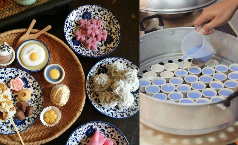 หรือจะเป็น บุหลันดั้นเมฆ (60 บาท/ชิ้น) แป้งเนียนนุ่มสีน้ำเงินสดจากดอกอัญชันสีสันสวย หอมกลิ่นดอกไม้ ได้รสหวานจากสังขยาด้านบนกำลังดี ซึ่งเป็นที่ชื่นชอบของลูกค้าทั้งไทยและชาวต่างชาติเป็นอย่างมาก แถมร้านนี้เขาเปิดเวิร์กชอปสอนทำขนมไทยด้วยนะ ถ้าใครดู กรงกรรม เห็นฉากที่เรณูทำขนมขายแล้วอยากทำบ้างก็แนะนำให้มาเรียนที่นี่เลย จะได้ใช้เวลาว่างให้เป็นประโยชน์หรือดีไม่ดีอาจจะเอาไปทำเป็นอาชีพหาเลี้ยงปากท้องแบบเรณูเลยก็ได้นะ