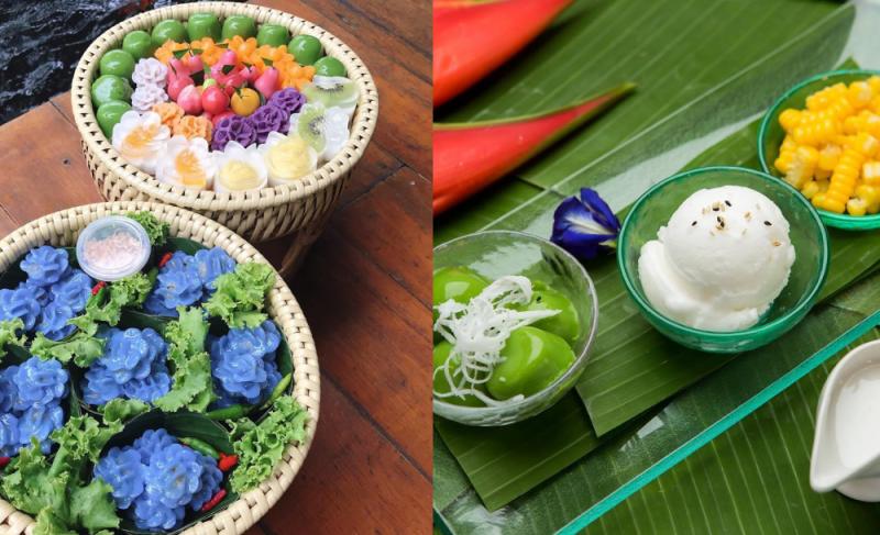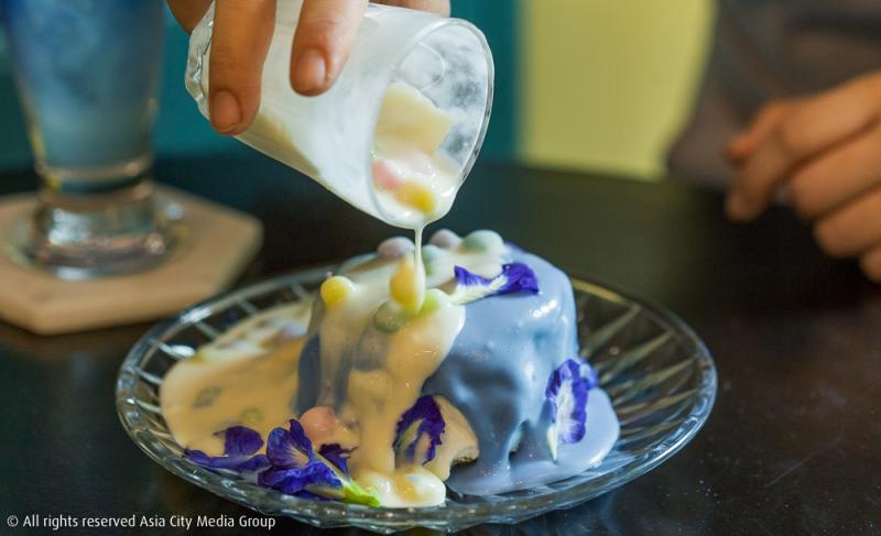 แต่เมนูที่แนะนำให้สั่งลองคือ ขนมช่อม่วง (100 บาท) ที่เป็นซิกเนเจอร์ของทางร้านแป้งสีม่วงที่ได้จากดอกอัญชัน สอดไส้ไก่ผัดปรุงรส ทานคู่ผักสด กระเทียมเจียว อร่อยลงตัว และ เปียกปูนทรงเครื่อง+ไอศครีมกระทิหอมหวาน (135บาท) ตัวนี้เป็นเปียกปูนสดหอม ๆ โรยเนื้อมะพร้าว เสริฟพร้อมข้าวโพดและไอศครีมมะพร้าวแบบโฮมเมดคลายร้อนแบบช่ำ ๆ แนะนำให้ไปลอง แถมที่นี่เขามีเมนูอาหารคาวด้วยนะ กินคาวก่อนแล้วตบด้วยของหวานครบจบในทีเดียว