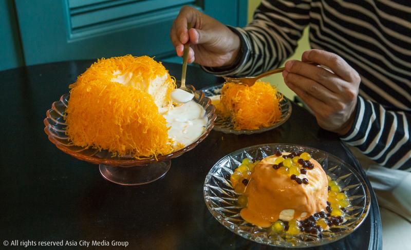 เสิร์ฟมาพร้อมกับขนมเค้กตามใจชอบอีก 2 ชิ้น ไว้ทานคู่กับชาร้อนสักกาคือดีงาม อีกหนึ่งเมนูแนะนำเป็นขนมหวานผสมกันระหว่าง ไอศกรีมชาไทย+เฉาก๊วย (120 บาท) ก็ถือเป็นเมนูตัวเลือกดับร้อนตอนกลางวันได้ดีเลย หรือจะเป็น ไอศกรีมใบเตย+บัวลอย (120 บาท) ไอศกรีม + ลอดช่อง (120 บาท) ซึ่งน่าจะเหมาะกับสายหวานอย่างคุณสาว ๆ ที่น่าจะชื่นชอบ