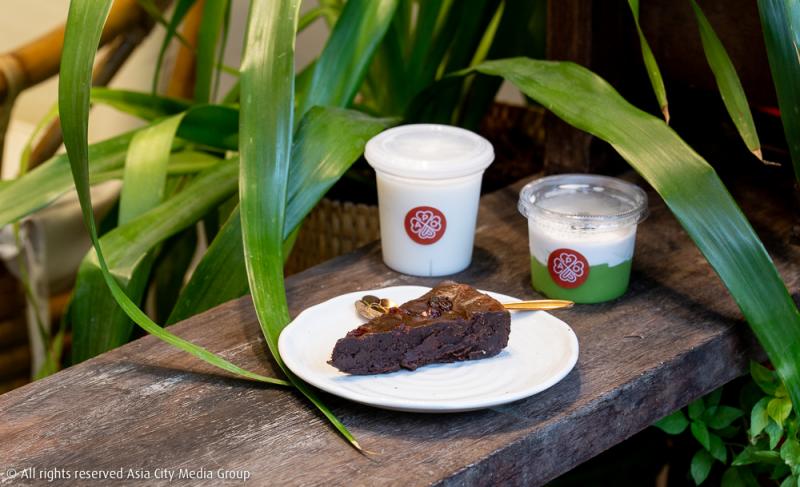 เขยิบมาที่ขนมฝีมือคุณแม่บ้าง ซึ่งถ้าเราไม่แนะนำขนมที่ขายดีที่สุดของทางร้าน (และหมดเร็วตลอดดด อยากให้รีบมากันหน่อยถ้าอยากลองชิม) อย่างเปียกปูนใบเตยมะพร้าวอ่อน (55 บาท) ก็คงจะผิดไปหน่อย เปียกปูนที่นี่แม้จะหน้าตาเฉย ๆ แต่ตักเข้าปากแล้วสายรุ้งพุ่งออกปากเลย คุณแม่เลือกใช้ใบเตยจากหลังบ้านที่ปลูกเอง ไร้สารเคมีใด ๆ กับมะพร้าวอ่อนที่คัดพิเศษจากบ้านแพ้ว จ.นครชัยศรี มาทำขนมตัวนี้ อีกตัวหนึ่งเป็นเต้าฮวยน้ำมะพร้าวอ่อน (40 บาท) ก็ใช้มะพร้าวจากบ้านแพ้วเช่นกัน ใครสายมะพร้าวน่าจะถูกใจไม่ยาก นอกจากนี้ยังมีบราวนี่แครนเบอรี่ (85 บาท) ที่คุณแม่ทำสด ๆ แบบโฮมเมด ที่ไม่ได้มีทุกวันด้วย บราวนี่เนื้อแน่น ไม่ร่วน ไม่หวานมาก ใส่แครนเบอรี่แห้งแบบแน่น ๆ ให้เคี้ยวหนึบ ๆ เพิ่ม ได้ฟีลแบล็กฟอเรสต์อยู่เหมือนกันนะ