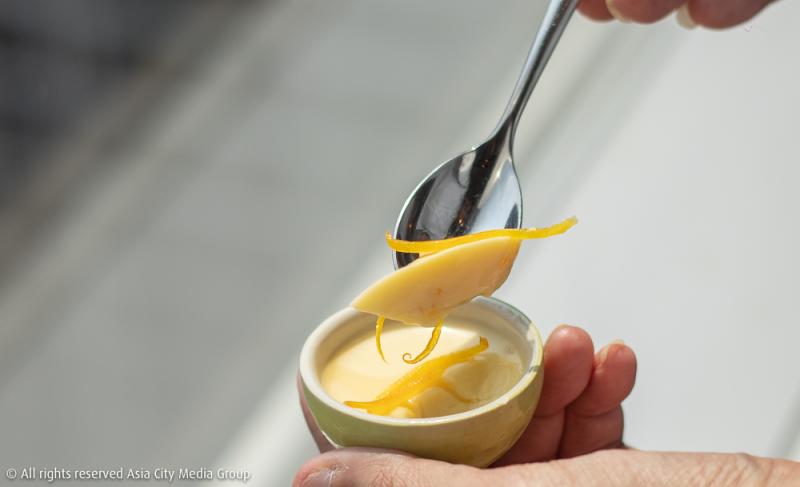 ต่อด้วยของหวานเซ็ตใหญ่ด้านบนที่มาในโทนสีส้ม แดง เหลือง น้ำตาล ทั้งหมด และดึงเอารสซิตรัส และยุสุมานำเสนอเป็นหลัก เริ่มที่มาการองที่พิมพ์ลายใบไม้เปลี่ยนสี, ครีมวานิลลารสยุสุ, แยมโรลไส้กาแฟ กับถั่วอัลมอนด์เคลือบน้ำตาล ที่เขาบอกว่าเป็นไส้กาแฟอาราบิก้าด้วย, เค้กมะนาวและวานิลลา ที่เปรี้ยวสะใจ กินแล้วตาตื่นเลยแหละ สุดท้ายกับทาร์ตช็อกโกแลตผสมส้มคิงคัน ขนมทุกชิ้นรสชาติคุมโทนมาเป็นอย่างดี มีการเบรกรสซิตรัสและความเปรี้ยวด้วยกาแฟกับช็อกโกแลตในบางชิ้น ทำให้มีมิติของรสชาติในเซ็ตขนมหวานนี้เพิ่มขึ้นได้เป็นอย่างดี
