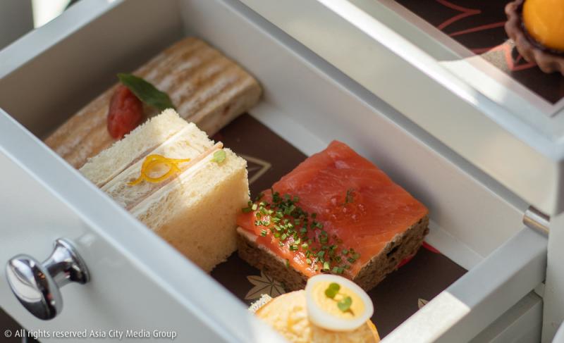 ดึงลิ้นชักออกมาจะเจอเหล่าอาหารคาวปุ๊กปิ๊กน่ารักที่จัดเซ็ตและเลือกวัตถุดิบได้คุมโทนสีสันมาก ๆ เริ่มตั้งแต่แซนด์วิชแฮมชีส เสิร์ฟกับแยมรสส้ม ที่เข้ากันเฉยเลย แถมเห็นชิ้นเล็ก ๆ แบบนี้ แต่เขาอัดชีสมาหนาสะใจมาก ต่อด้วยขนมปังหน้าแซลมอนรมควัน เสิร์ฟกับไข่ปลาแซลมอนและต้นกระเทียม, ขนมปังไส้ไข่มิโมซ่า มาในไซซ์พอดีคำ และขนมปังเซียบัตต้าไส้ซอสเพสโต้ มะเขือเทศ และมอสซาเรลล่าชีส ท็อปด้วยมะเขือเทศที่นำไปตุ๋นในน้พมันมะกอก ตัวนี้อร่อยมาก ๆ ได้ความเปรี้ยวจากมะเขือเทศ ตัดด้วยความมันของชีส เวิร์กดีจริง ๆ