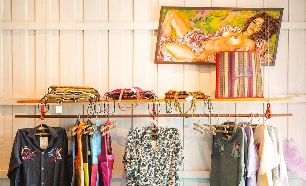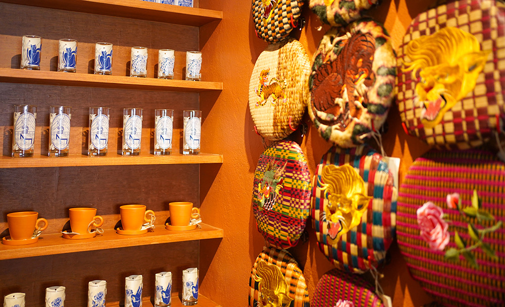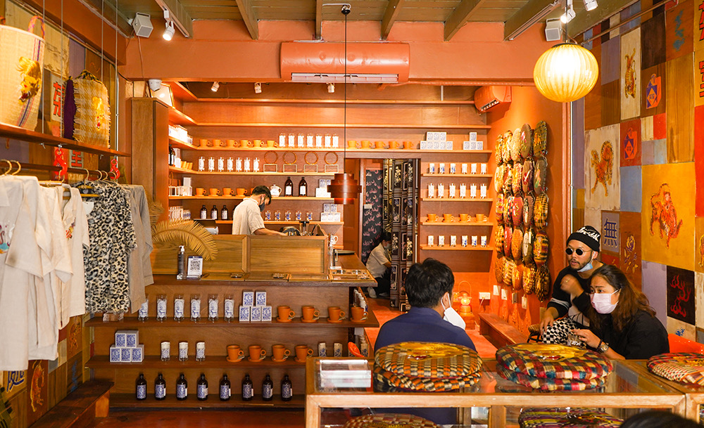 นอกจากจะเป็นทีรูมสายลึกแล้ว Citizen Tea Canteen of Nowhere ยังเป็นพื้นที่กึ่งโชว์รูมของแบรนด์ Citizen of Nowhere แบรนด์แฟชั่นสัญชาติไทยของคุณศรัณย์ ที่สายสตรีตน่าจะคุ้นเคยกันดีจากเอกลักษณ์ความไทยชิค ที่จับเอาลวดลายและกลิ่นอายของงานคราฟต์จากภูมิปัญญาท้องถิ่นมาใส่ไว้ในไอเทมต่าง ๆ ตั้งแต่เสื้อผ้า หมวก ไปจนถึงบรรดาของใช้ในบ้านอย่างถ้วยกาแฟ
