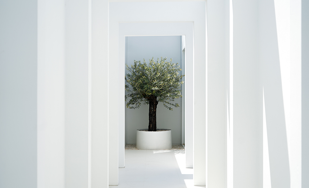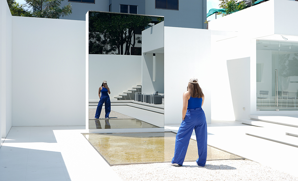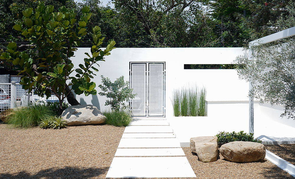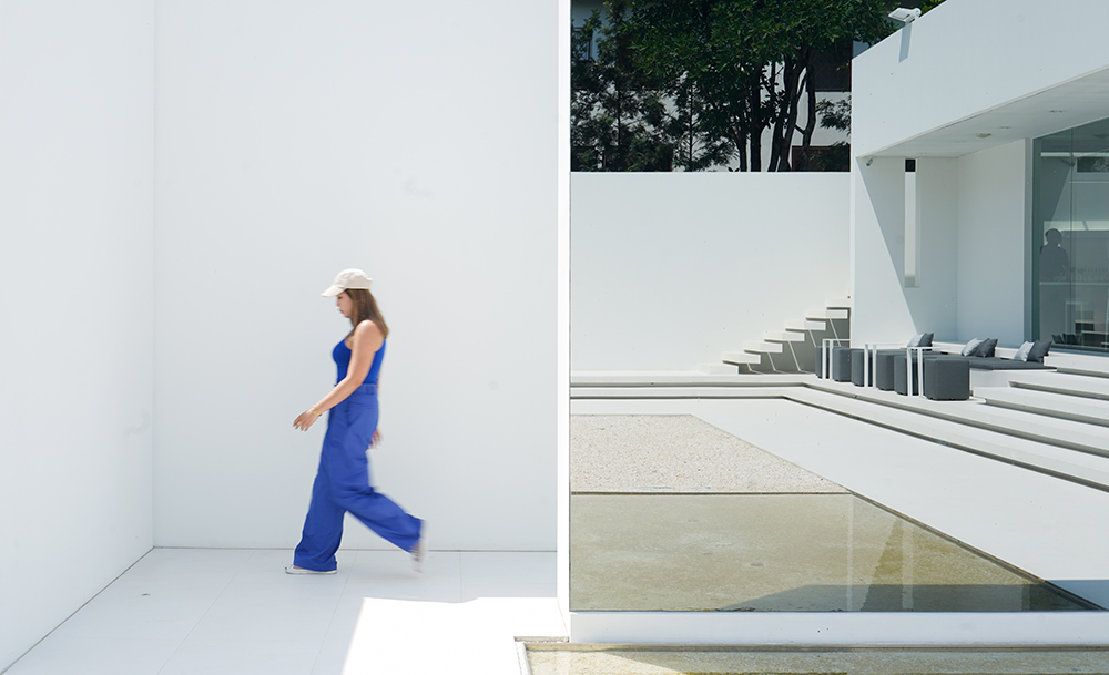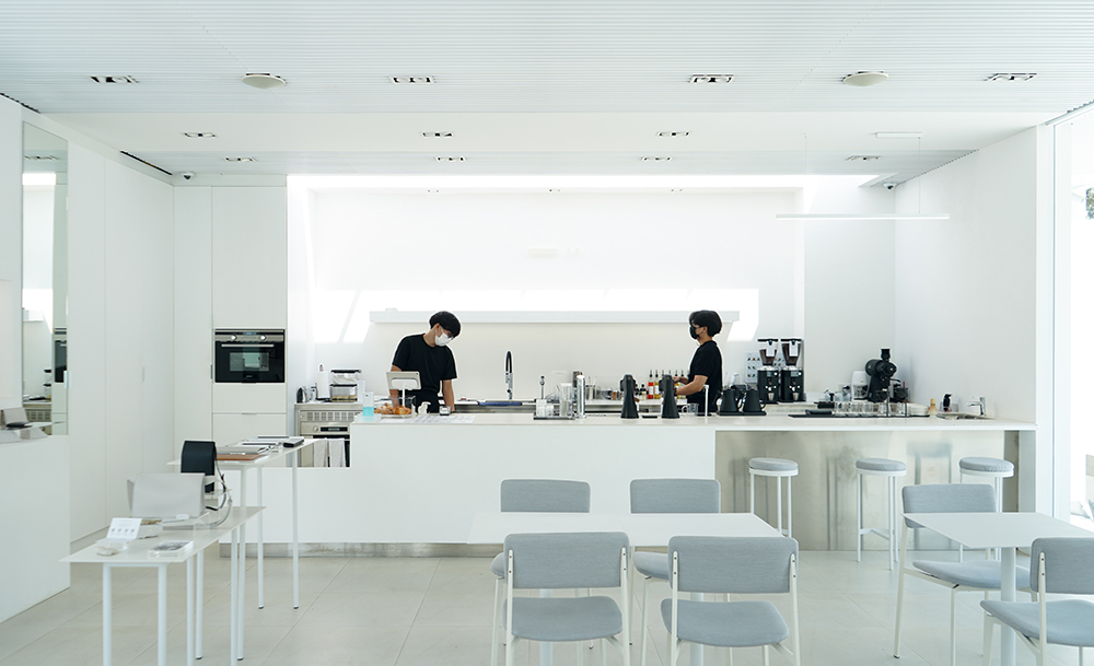 พื้นที่ทั้งหมดในร้านทั้งภายนอกและภายใน อยู่ภายใต้คอนเซปต์ของความมินิมอลร่วมสมัย แต่โดดเด่นและมีเอกลักษณ์ด้วยรายละเอียดเล็ก ๆ น้อย ๆ ที่อัดแน่นแทรกตัวอยู่ในพื้นที่ของร้าน ไม่ว่าจะเป็นการออกแบบพื้นเล่นระดับที่ช่วยเพิ่มมิติให้กับพื้นที่ภายนอก การซ่อนพื้นที่บังตาที่เพิ่มความเซอร์ไพรส์และชวนให้เราออกไปเดินเล่นสำรวจ ไปจนถึงการออกแบบพื้นที่ภายใน ที่ให้ความสำคัญกับแสงธรรมชาติด้วยการติดกระจกล้อมรอบ เพดานสูงที่ให้ความรู้สึกโปร่งสบาย และการตกแต่งด้วยสีขาวสบายตาที่ทำให้เรารู้สึกอยากนั่งปล่อยใจกับกาแฟแก้วโปรด