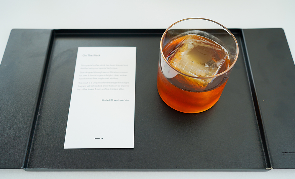 สำหรับสายกาแฟตัวจริง เราอยากให้ลอง On The Rock (250 บาท) เมนูพิเศษที่เสิร์ฟเพียงแค่ 30 ที่ต่อวัน ความพิเศษอยู่ที่กระบวนการการบริวและดริปที่ใช้เวลาถึง 6 ชม. เพื่อให้ได้กาแฟที่มีความใส ตัดรสขมออกไปจนหมด เหลือแต่รสชาติที่เป็นเอกลักษณ์ของกาแฟ ให้ความรู้สึกเหมือนกำลังดื่มวิสกี้ที่ให้ความสดชื่น จิบไปแล้วก็แอบคิดว่าคนไม่ชอบรสขมของกาแฟก็อาจจะจอยกับแก้วนี้ได้เหมือนกันนะ