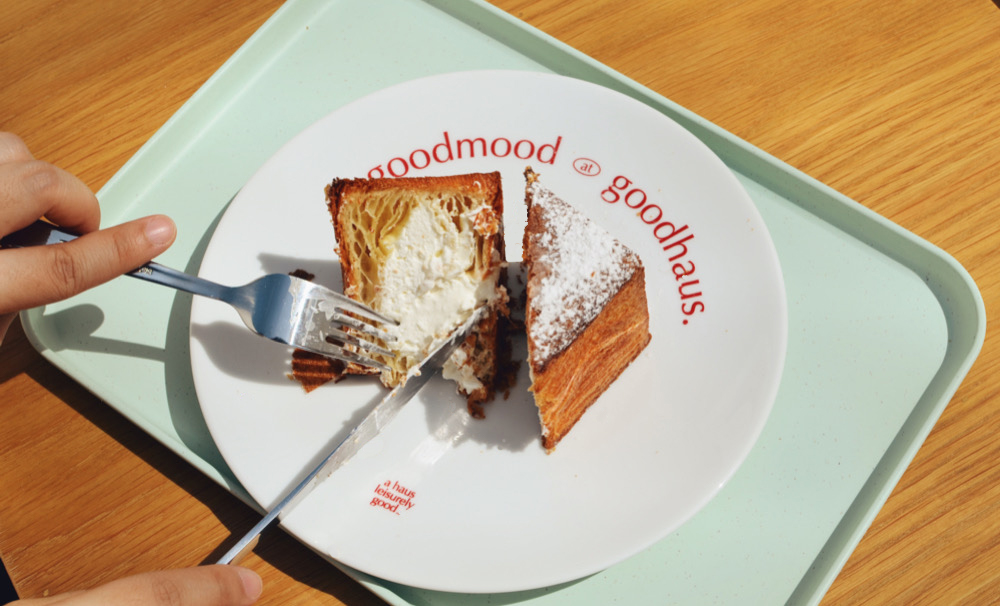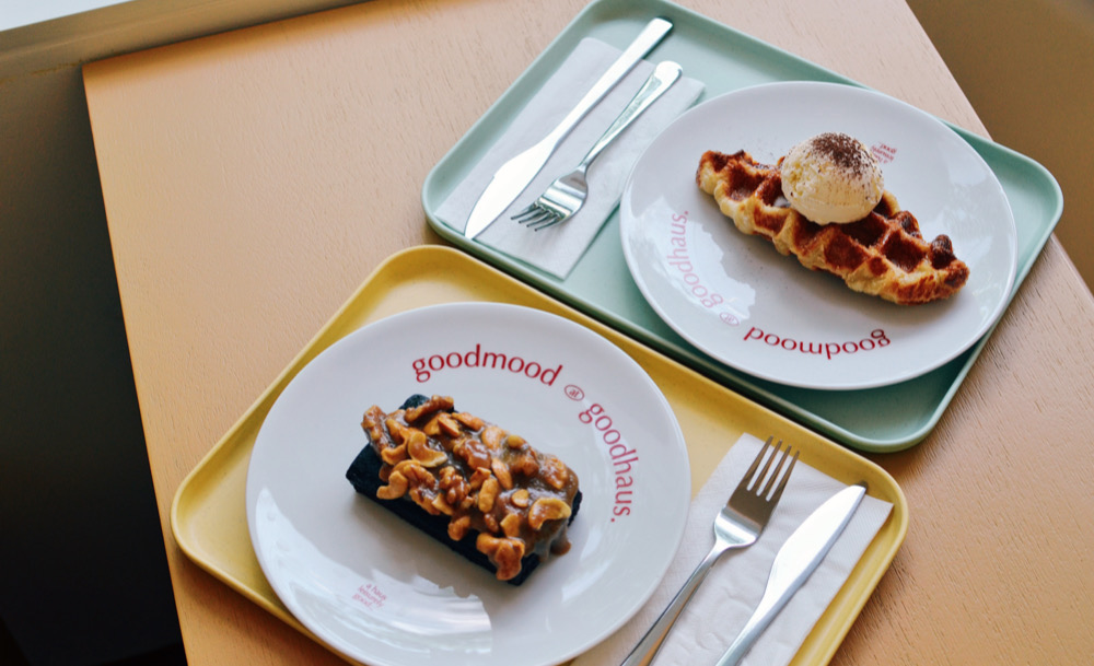 นอกจากเมนูเครื่องดื่มแล้ว ที่ Good Haus BKK เขาก็ยังเอาใจเหล่าเด็กหิวเด็กอ้วนทั้งหลายด้วยการเสิร์ฟเมนูขนมหลากหลาย ตัวที่เราชอบที่สุดก็คือเมนูคุ้นหน้าคุ้นตาอย่าง Toffee Nut Cake (120 บาท) เค้กทอฟฟี่เนื้อละมุนที่ราดหน้าด้วยถั่วคาราเมลหวาน ๆ มัน ๆ แม้จะเป็นเมนูที่กินบ่อยแล้ว แต่เราอยากให้ทุกคนได้มาลองของที่นี่มาก ๆ เช่นเดียวกับ Haus Croffle (155 บาท) เมนูลูกผสมระหว่างครัวซองกับวาฟเฟิลที่โปะไอศกรีมโฮมเมดรสวานิลลาสูตรของทางร้านมาลูกโต ๆ เราแอบชอบครอฟเฟิลของร้านนี้ที่ไม่หวานเกินไป ทานคู่กับไอศกรีมแล้วเข้ากันสุด ๆ