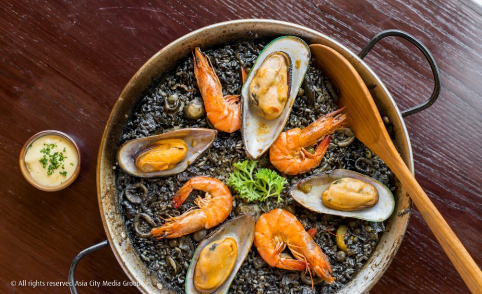 เริ่มจาก Tostas (ตอสตา, 150-250 บาท) หรือแซนวิชหน้าเปิดที่เป็นอาหารเช้ายอดนิยมของชาวสเปน ตามด้วยเมนู Racinoes (ราซิโอเนส) อย่าง Croquetas (ครอเกตาส 5 ชิ้น 150 บาท) และเมนูหนักๆ อย่างข้าวผัดปาเอญ่าที่ปรุงตามแบบฉบับดั้งเดิมจากบาเลนเซีย เราได้ลอง Arroz negro (850 บาท) ข้าวดำปรุงจากน้ำหมึกของปลาหมึก ผัดแบบข้าวยังเป็นเม็ดกำลังพอดี ไม่แห้งไป ไม่แฉะไป เครื่องเทศคลุกเคล้าเข้าถึงเนื้อกุ้ง หอย และหมึกจริงๆ แถมเสิร์ฟมาในกระทะใหญ่ กินได้ 3-4 คนสบายๆ
