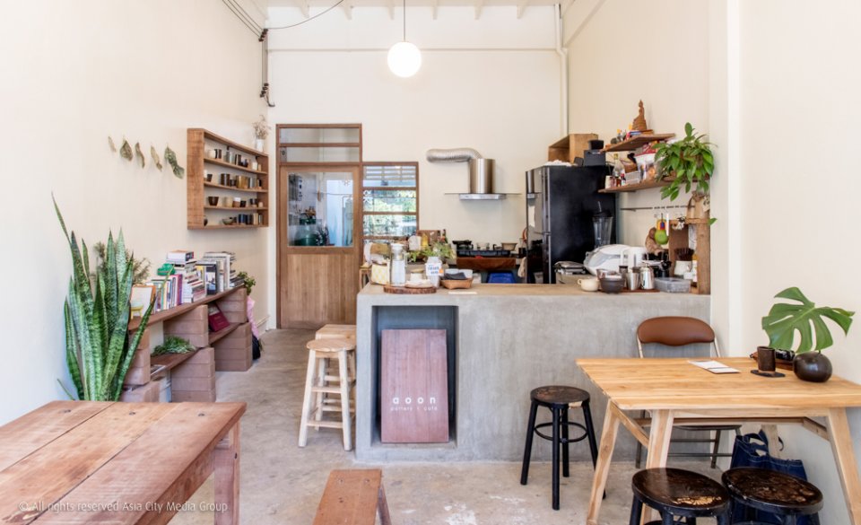 หนีความวุ่นวายของเยาวราชไปนั่งชิลใน Aoon คาเฟ่แห่งใหม่ที่เป็นสตูดิโอเครื่องปั้นดินเผาไปด้วยในตัว เมื่อก้าวเข้าไปในร้าน สายตาเราจะปะทะกับชุดสีเอิร์ธโทน ไม่ว่าจะเป็นผนังสีครีม บาร์ปูนเปลือย ชั้นวางของที่ก่อขึ่นจากอิฐก้อนซ้อนเรียงกัน ตลอดจนโต๊ะเก้าอี้ไม้สีน้ำตาลหลากเฉด รับแสงธรรมชาติจากกระจกใสบานใหญ่ได้พอดิบพอดี