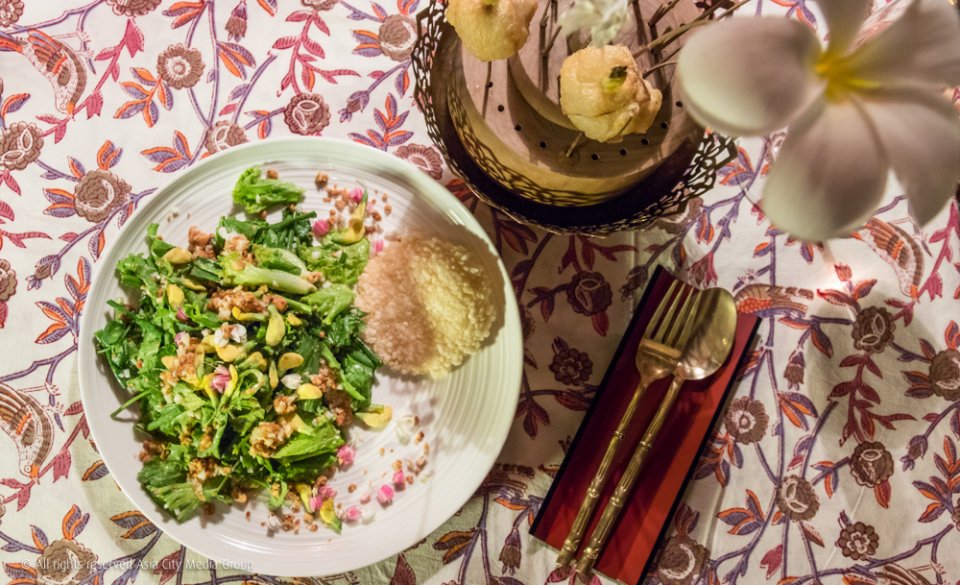เซ็ตดินเนอร์เคาะราคาอยู่ที่ 1,450 บาท ซึ่งอาหารสุดสร้างสรรค์แต่ละเมนูก็ได้แรงบันดาลใจมาจากการเดินทางท่องเที่ยวของพี่สกุล เช่น สลัดเมืองหลวง เมนูผักเขียวและสมุนไพรที่แอบซ่อนกลิ่นอายหลวงพระบาง เสิร์ฟพร้อมข้าวตังและหมูทอดห่อดอกลีลาวดี