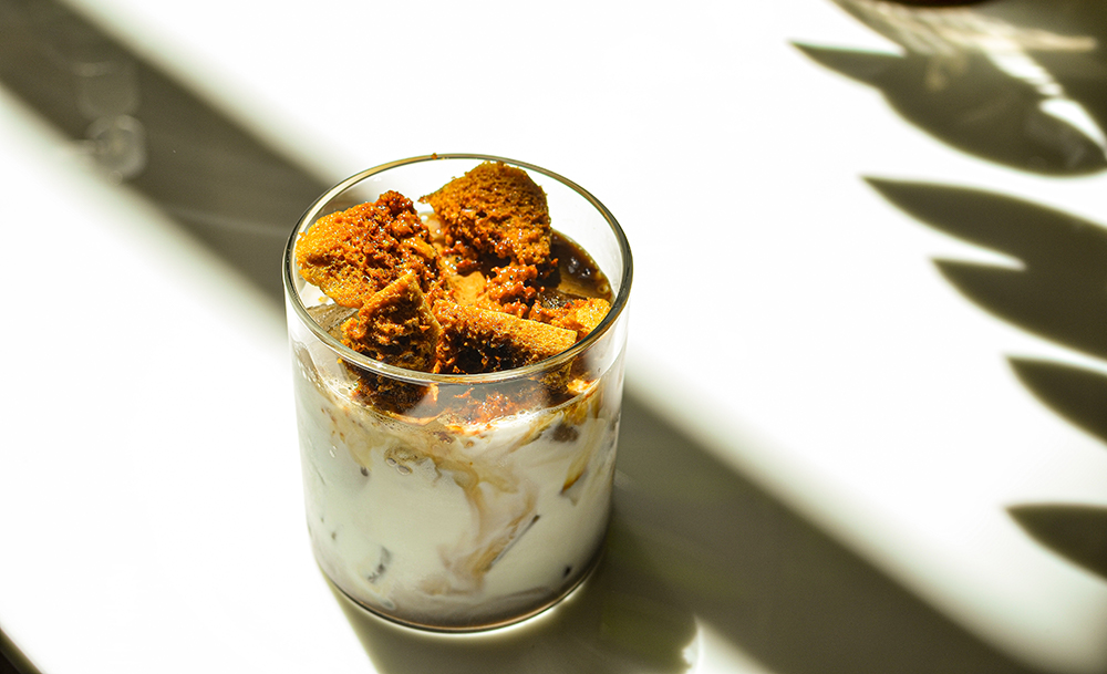 เมนูแรกที่ทางร้านแนะนำให้เราลองก็คือ Dalgona Latte (120 บาท) เมนูที่เคยเป็นไวรัลฮิตในช่วงกักตัวที่ผ่านมาที่มีเอกลักษ์เด่นคือการตีกาแฟให้เป็นฟองแล้วเทท็อปด้านบน ซึ่งทัลโกนาของที่ร้านจะไม่ได้มาเป็นฟองกาแฟข้น ๆ แบบที่เห็นกันในคลิป แต่เป็นการเสิร์ฟทัลโกนา ซึ่งเป็นขนมดั้งเดิมของชาวเกาหลีที่เป็นแผ่นน้ำตาลบด ท็อปมาบนกาแฟนมหอม ๆ ที่เบสมาแบบไม่หวาน เพื่อที่เวลาดื่มกับแผ่นน้ำตาลด้านบนแล้วจะไม่หวานบาดคอ ซึ่งแก้วนี้เป็นแก้วที่ค่อนข้างเซอร์ไพรส์สำหรับเราที่เป็นคนชอบดื่มเมนูกาแฟนมแบบง่าย ๆ ไม่หวือหวา แต่พบว่าแก้วนี้จิบได้เพลิน ๆ เรื่อย ๆ แบบไม่ตะขิดตะขวงใจ และแอบเพลินกับแผ่นน้ำตาลด้านบนแบบไม่รู้สึกผิดบาป