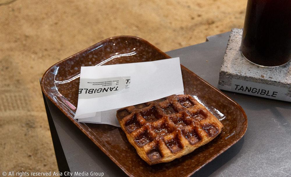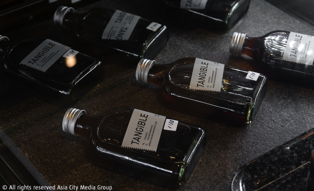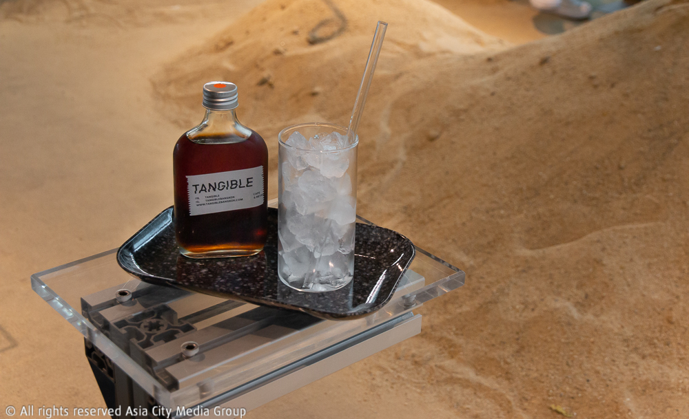 เดินตามกลิ่นกาแฟหอม ๆ แบบเข้มข้นชัดเจนมาที่พื้นที่ถัดมาซึ่งเป็นส่วนของคาเฟ่ อย่างที่รู้กันดีว่าเครื่องดื่มคู่ใจนักออกแบบก็คงหนีไม่พ้นกาแฟ Tangible จึงถือโอกาสเสิร์ฟกาแฟตามสไตล์และรสชาติที่ชาวไตรโหมดสตูดิโอเขาชอบดื่มกัน ซึ่งก็เป็นที่มาของเมนู Cold Brew (150 บาท) ที่พวกเขาเสิร์ฟ Blend ที่ดื่มกันเองในกลุ่ม ซึ่งได้ Rosetta Coffee Roasters มาช่วยออกแบบกลิ่นและรสชาติ จนได้ออกมาเป็นกาแฟรสชาติเข้ม ๆ ที่ดื่มแล้วต้องตื่น ตื่นทั้งคนทำงาน ตื่นทั้งต่อมความครีเอทีฟ
