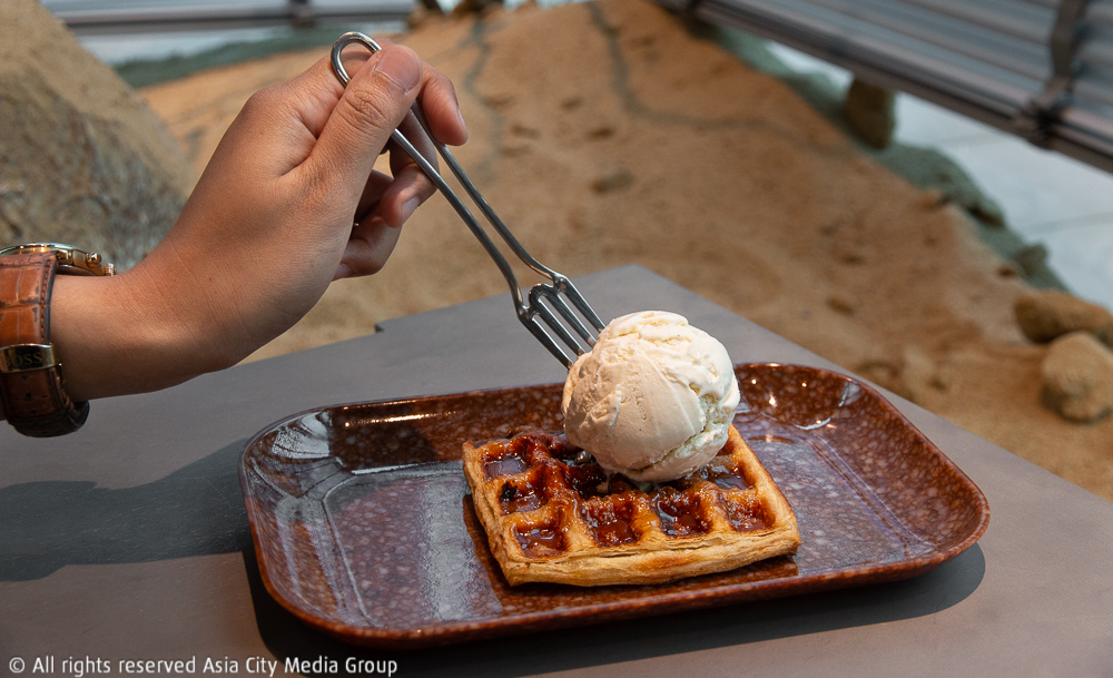 และใช่ว่านักออกแบบเขามีแค่กาแฟเป็นเครื่องชุบชูใจ ทำงานหนัก ๆ ก็ต้องขอแป้งและน้ำตาลมาเติมพลังและปรนเปรอร่างกายตัวเองกันบ้าง ที่นี่เขาจึงมีเมนูของหวานให้เลือกสั่งมาทานคู่กับกาแฟด้วย โดยเมนูประจำร้านและประจำกลุ่มของเขาก็คงหนีไม่พ้น Croffle (85 บาท) ซึ่งดัดแปลงมาจากครัวซองต์ที่ทางกลุ่มชอบทาน แต่เพื่อสร้างความแปลกใหม่ เขาจึงไปเชิญทางร้าน Amatissimo ให้มาช่วยสร้างสรรค์เมนูขนมจานใหม่ กลายเป็นวาฟเฟิลที่ได้สัมผัสความหนุบหนับและความกรอบของครัวซองต์ แต่ถ้าใครรู้สึกว่ายังไม่หวานเยียวยาวันอันเหนื่อยล้าไม่พอ เขาก็มีเมนู Croffle Vanilla (165 บาท) ที่โปะไอศกรีมวานิลลาหอม ๆ สดชื่นมาอีก 1 ลูกโต ให้เราใจละลายไปกับเมนูของหวานจานนี้กันแบบลืมควบคุมแป้งและน้ำตาลไปเลย