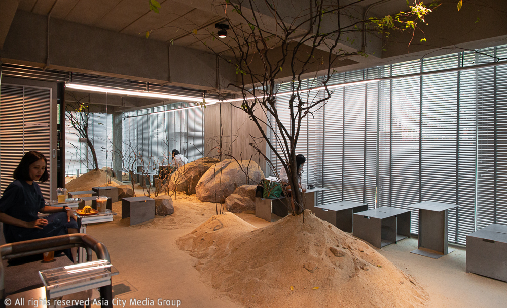 การตกแต่งภายในร้านที่โดดเด่นด้วยการเล่นระดับของพื้น และการโชว์ซิกเนเจอร์ของสตูดิโอแห่งนี้ด้วยเฟอร์นิเจอร์รอว์แมทีเรียล เป็นส่วนหนึ่งของแนวคิดในการตกแต่งสเปซภายใต้คอนเซปต์ Creative Flow ที่เขารวบรวมดีเทลและสิ่งที่จุดประกายความคิดที่พวกเขาพบเจอระหว่างการทำงานออกแบบ มาใส่ไว้ในพื้นที่แห่งนี้ เพื่อให้คนที่เข้ามาใช้พื้นที่ได้เกิดความคิดสร้างสรรค์ระหว่างที่นั่งจิบกาแฟแก้วโปรด