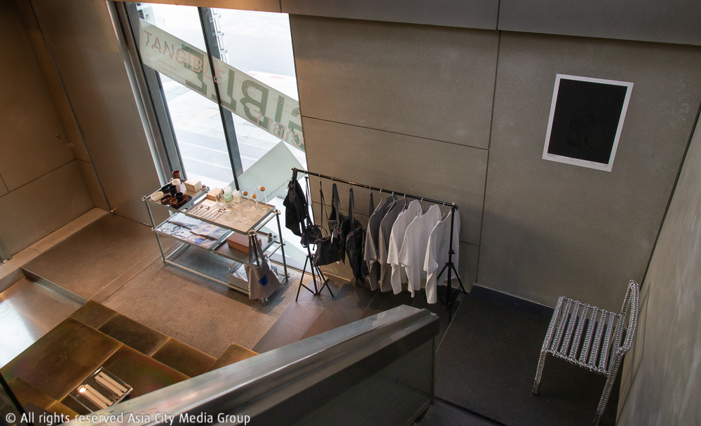 สเปซของ Tangible ถูกแบ่งออกเป็น 2 ส่วน โดยส่วนแรกจะเป็นพื้นที่ 'โชว์ของ' ของไตรโหมดสตูดิโอ ที่เขานำผลิตภัณฑ์ที่พวกเขาออกแบบภายใต้แบรนด์ลูกที่ชื่อว่า Trimode Accessories และผลิตภัณฑ์ที่พวกเขาพัฒนาร่วมกับชุมชนภายใต้ชื่อ Trimode.C มาวางไว้ให้เราเลือกหยิบชอปกันได้ เช่นเดียวกันไอเทมต่าง ๆ ที่พวกเขาชอบเป็นการส่วนตัว ก็ถูกนำมาวางให้เลือกหยิบตามสไตล์ซีเลกเต็ดชอปเช่นกัน