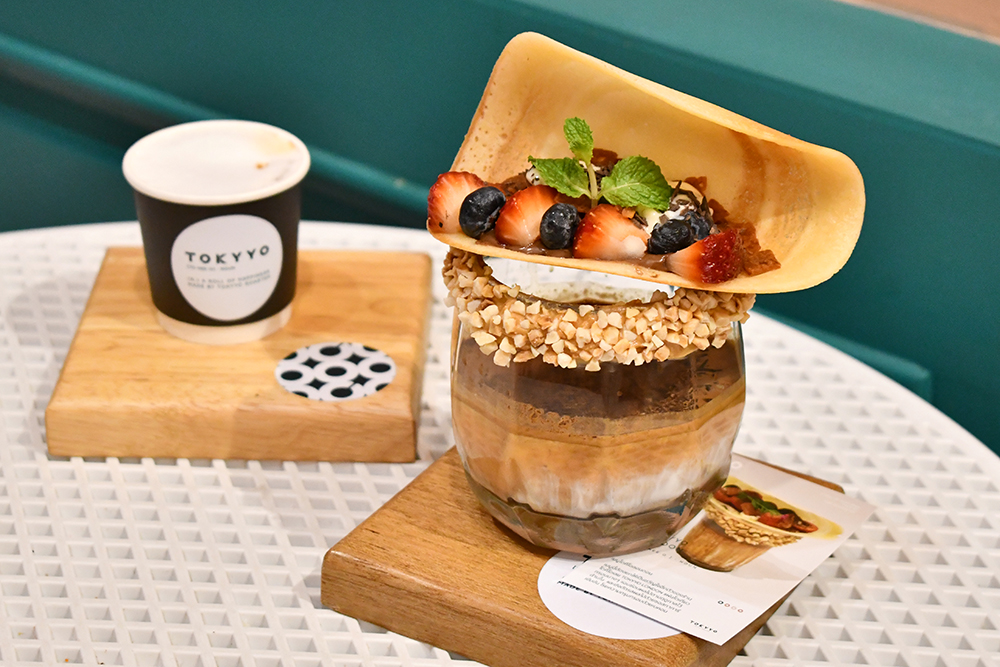 มาเริ่มกันที่เมนูซิกเนเจอร์ที่ใครมาถึงก็ต้องสั่งอย่าง Tokyyo London (199 บาท) ที่นำโปรดักต์หลักของร้านทั้งสองอย่าง คือ โตเกียวและกาแฟ มาเสิร์ฟคู่กัน โดยในแก้วด้านล่างจะเป็นกาแฟเดอร์ตี้สูตรพิเศษของร้านที่รสชาติหวานน้อย มีเซอร์ไพรส์ด้วยถั่วเคลือบคาราเมลที่ปากแก้ว และด้านบนมีโตเกียวแป้งบางกรอบสอดไส้ผลไม้ตามฤดูกาลที่มักจะเป็นตระกูลเบอร์รี อาทิ สตรอว์เบอร์รีและบลูเบอร์รี สำหรับเพิ่มรสเปรี้ยวแก้เลี่ยนและเติมสีสันให้แก้วซิกเนเจอร์แก้วนี้ได้เป็นอย่างดี