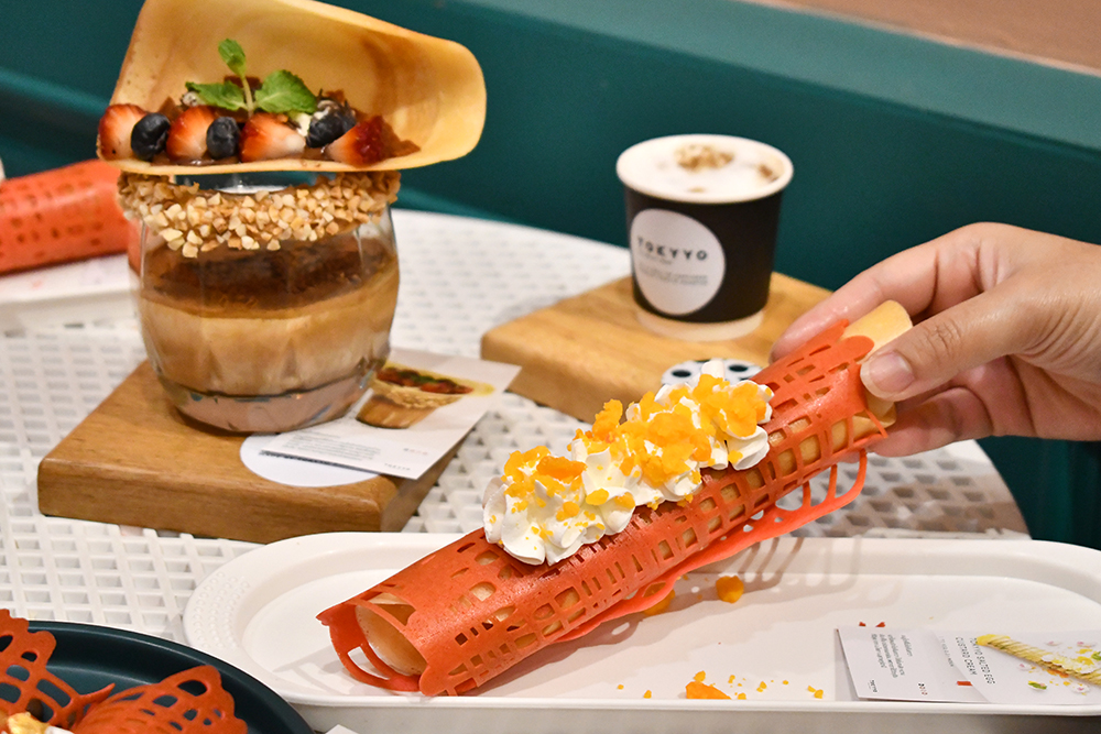 มาจัดหนักกันต่อที่พาร์ตขนมโตเกียว ซึ่งได้ชื่อว่าเป็นอีกหนึ่งร้านที่นำเมนูวันวานมาจับแปลงร่างซะดูดีจนแทบจำไม่ได้ เริ่มจาก Tokyyo Vanilla Cream Cheese With Golden Threads (85 บาท) โตเกียวไส้ฝอยทอง ของโปรดเราสมัยเด็ก ๆ เป็นขนมโตเกียวไซซ์มินิที่เสิร์ฟมาเป็นเซตให้ได้หยิบกินแบบเพลิน ๆ หรือถ้าใครชอบแบบชิ้นใหญ่ ๆ ก็สามารถสั่ง Tokyyo Salted Egg Custard Cream (60 บาท) มาทานได้เลย เพราะนอกจากจะจัดแป้งโตเกียวแผ่นใหญ่ไซซ์ยักษ์มาแล้ว ยังมาพร้อมไส้คัสตาร์ดครีมไข่เค็มที่เคี่ยวเองจนเนื้อเนียนแน่นแบบจุก ๆ