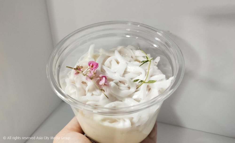อย่างที่สองเป็นเมนูจาก ไทไท บาย Yellow Spoon เหมือนกัน และยังคงเน้นความหอมมันที่ไม่ติดหวานเช่นเคย กับเมนูเค้กอัญชันมะพร้าวอ่อน ที่รองชั้นล่างสุดด้วยเค้กเนื้อนุ่ม แล้วท็อปด้วยครีมสดเนียน ๆ ปิดท้ายความพีกด้วยเนื้อมะพร้าวอ่อนที่โรยมาแน่น ๆ ตักมาคำหนึ่งนี่มีแต่วัตถุดิบดี ๆ พูนช้อนไปหมดเลย อันนี้ก็มีให้สั่งทั้งไซซ์เล็กกินคนเดียวและไซซ์ใหญ่กินหลายคนนะ