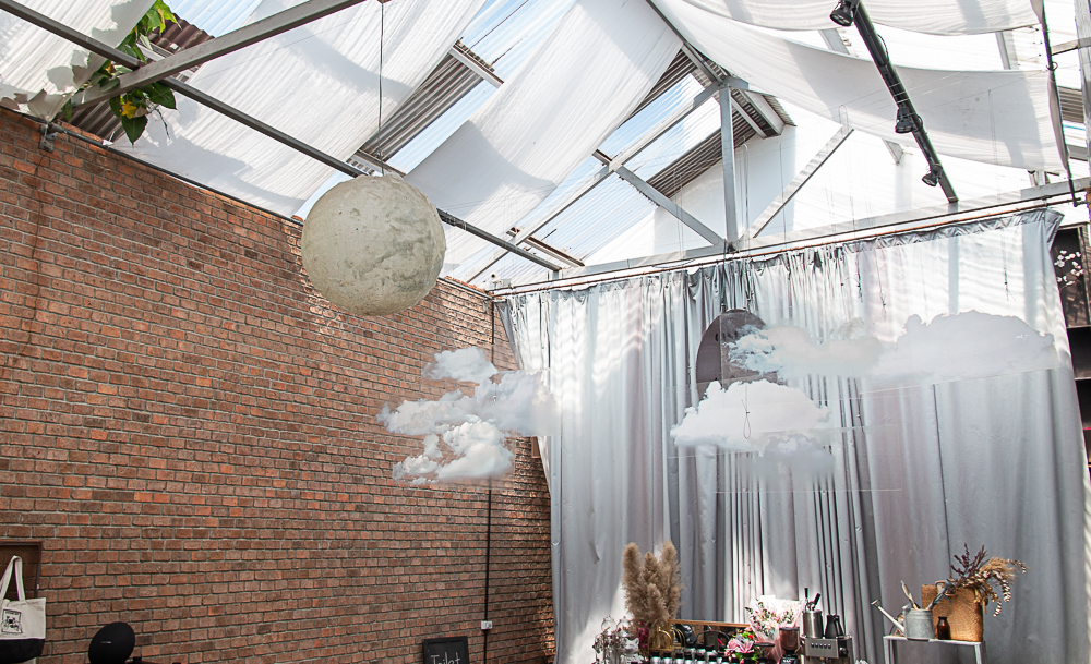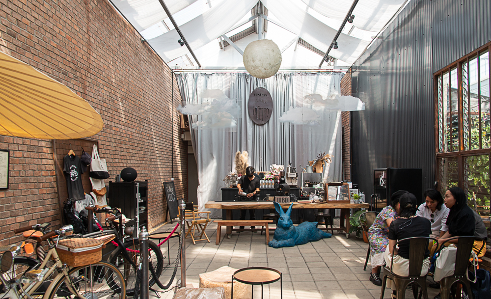 เมื่อก้าวเข้าไปในโรงนากลิ่นกาแฟ สิ่งแรกที่รอต้อนรับเราอยู่ก็คือเจ้ากระต่ายสีฟ้าตัวยักษ์และมวลเมฆที่ลอยอยู่เหนือศีรษะ โดย คุณแบงค์ กิตติชล เรืองพุ่ม หนึ่งในหุ้นส่วนของร้านและคนคุ้นเคยที่เคยเปิดโลกกาแฟกลิ่นดอกไม้ให้แก่เรา ก็อธิบายว่า WBD Cafe แห่งซ.ปรีดีพนมยงค์นี้จะเป็นองก์แรกของเรื่องราวการผจญภัยตามหาดวงจันทร์ของเจ้ากระต่ายกับหมาป่า ที่กำลังจะออกตามล่าดวงจันทร์ไปทั่วกรุงเทพฯ พร้อมพากลิ่นกาแฟและเมนูอาหารอร่อย ๆ ตามไปเสิร์ฟตามย่านต่าง ๆ ของกรุงเทพฯ ด้วย!