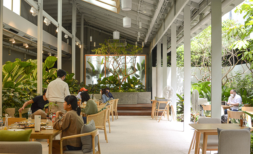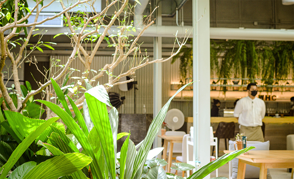 นอกจากความโคซี่ที่ชวนให้เข้ามานั่งปล่อยใจตั้งแต่เช้ายันบ่ายแล้ว ภายในพื้นที่ของ WH Cafe ยังโดดเด่นด้วยการจำลองบรรยากาศของป่า อันเกิดมาจากความอุดมสมบูรณ์ของพันธุ์ไม้กว่า 1,500 ต้น ซึ่งการปลูกต้นไม้หลากหลายสายพันธุ์ในพื้นที่ในร่มเช่นนี้ก็ทำให้ทางร้านต้องควบคุมอุณหภูมิและสภาพแวดล้อมอย่างเคร่งครัดที่สุด จนทำให้ผู้ที่เข้าไปใช้บริการในพื้นที่ก็พลอยได้ประโยชน์จากอากาศที่ไม่ร้อนเกินไป และได้รับแสงแดดในปริมาณที่เหมาะสมด้วย