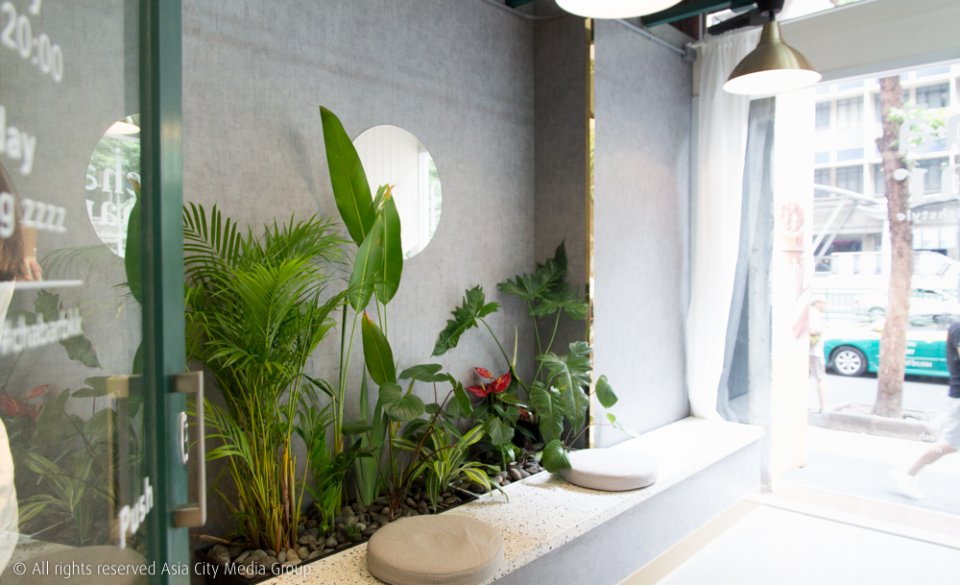 พอร้านใหญ่ขึ้น คราวนี้เลยมีที่นั่งให้ลูกค้าด้วย (เสียที !) พื้นที่นั่งพักเก๋ ๆ ไซซ์มินิที่ถูกตกแต่งอย่างเรียบง่าย ด้วยกำแพงกระเบื้องขาว กับซุ้มต้นไม้สีเขียวดูตัดกันดี คุณนิวบอกว่าต้นไม้ตรงนี้จะเปลี่ยนใหม่ทุก ๆ 3 เดือนเพื่อให้ได้อารมณ์ที่แตกต่างกันออกไปด้วย แต่โซนนั่งจุดนี้ก็ไม่ได้ตั้งใจทำให้นั่งกันจริงจังยาว ๆ ไปนะ คุณนิวเลือกที่จะมีเพียงม้านั่งยาวตัวหนึ่งโดยไม่มีโต๊ะ เพราะยังอยากให้เป็นเครื่องดื่มแบบ Grab & Go อยู่เช่นเดิม ถึงอย่างนั้นก็ถือแก้วแล้วแวะเข้าไปแชะรูปเซลฟี่ตัวเองสักหน่อยก็ได้ เพราะเราก็ทำ (ฮา)