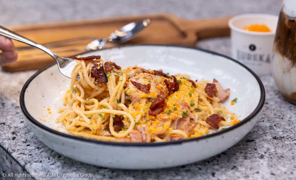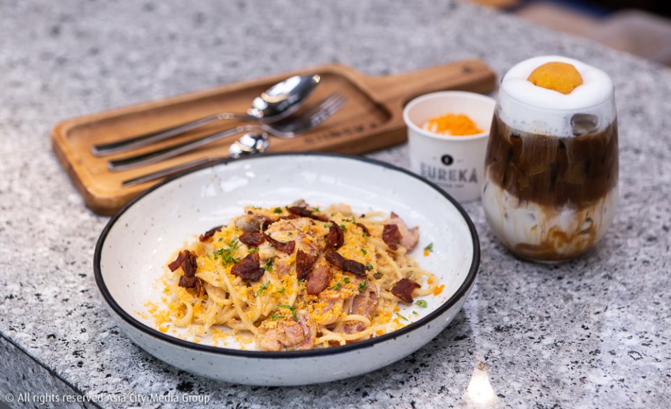 เมนูคุ้นเคยอย่างสปาเก็ตตี้คาโบนาร่าถูกนำมาจับคู่กับไอเทมเด็ดของร้านนี้อย่างไข่เค็ม จนกลายเป็น Kai Kem Carbonara (240 บาท) ที่เอาไข่แดงเค็มไปคลุกกับไวท์ครีมซอสของคาโบนาร่าจนเข้มข้นนัวปาก แน่นอนว่าเราก็ไม่ลืมสั่งมากินคู่กับเมนูเครื่องดื่มไข่เค็มของที่ร้านที่เรารักเสมอไม่เปลี่ยนแปลงอย่าง Kai Kem Latte (140 บาท)