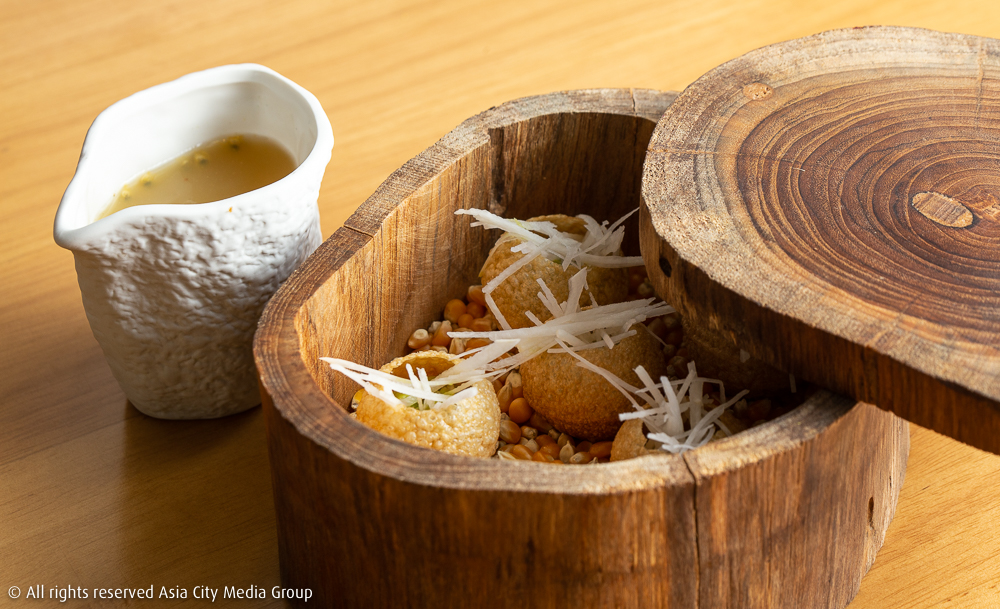 เริ่มต้นกันที่ Pani Puri (290 บาท) ออร์เดิฟพอดีคำที่มีวิธีกินสุดแปลกคือการเทน้ำเสาวรสลงไปในแป้งแล้วทานในคำเดียว จะได้ความเปรี้ยวจี๊ดจ๊าดตัดกับความมันของอะโวคาโดบด จากนั้นเราได้ลองเมนูที่หนักท้องขึ้นอย่าง Masala Maska Bun (190 บาท) ขนมปังมันฝรั่งอบใหม่ ๆ หอมกรุ่นกับรสสัมผัสเหนียวนุ่ม ปาดด้วย Pav Baji Butter เนยผสมแกง