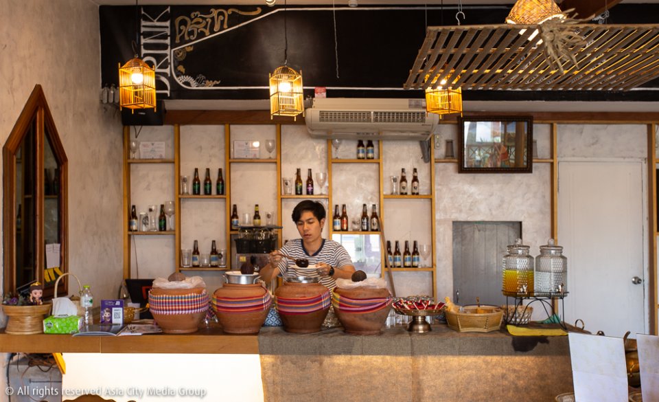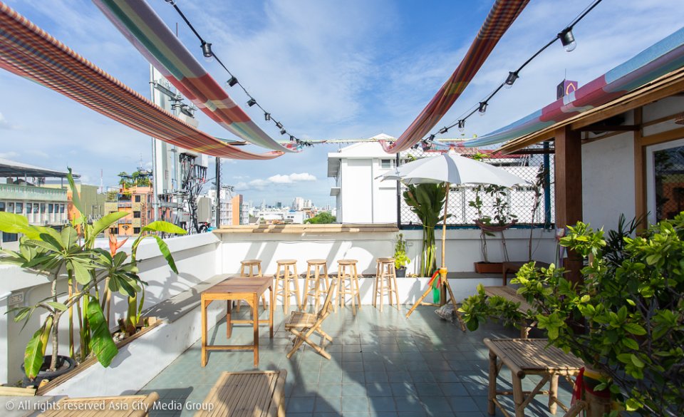 ทันทีที่ก้าวเข้าไปภายในร้าน บรรยากาศก็ชวนให้รู้สึกเหมือนอยู่ในบ้านไทยสมัยก่อน ทางร้านเลือกใช้การตกแต่งแบบไทย ๆ มีความพื้นบ้านนิด ๆ เพื่อดึงความเป็นคาเฟ่ขนมไทยออกมาให้ชัดเจน อบอวลไปด้วยกลิ่นหอมอ่อน ๆ ของขนม นอกจากนั้นแล้ว อีกหนึ่งไฮไลต์ที่ดึงสายตาและเชิญชวนให้เราเดินไปหา ก็คือมุมรูฟท็อปที่จะเห็นวิวของย่านบางลำพูมุมสูงนี่เอง