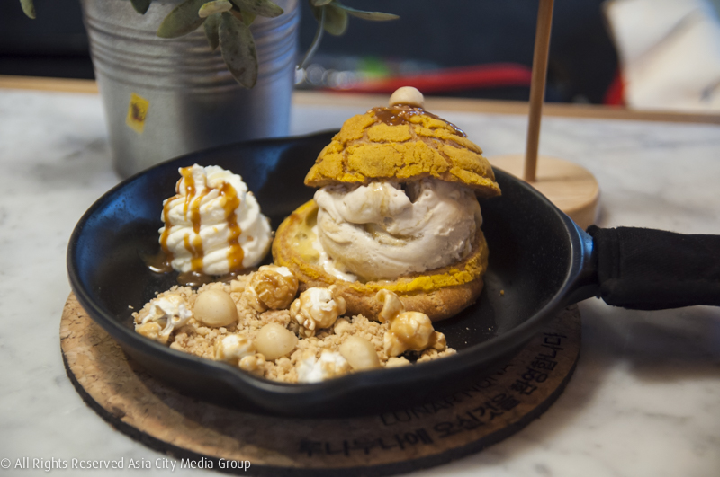 นอกจาก Dutch Baby ที่เป็นพระเอกแล้ว พระรองที่นี่ก็ไม่น้อยหน้า โดยเฉพาะกับชูครีมที่เอามาผสมไอศกรีมนุ่มครีมอย่าง Giant Star Sea Salted Caramel Popcorn Choux Cream (235 บาท) ชูครีมชิ้นยักษ์เสิร์ฟกับไอศกรีมซีซอลท์คาราเมล และป็อปคอร์นในรสเดียวกัน
