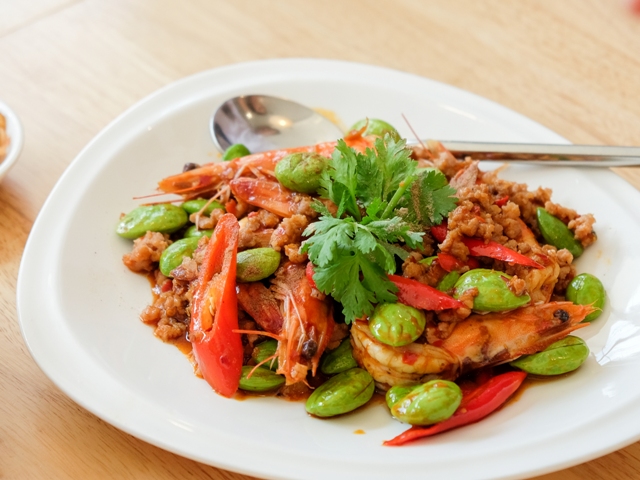 ที่เราชอบมากคือข้าวคลุกปลาทู (135 บาท) เสิร์ฟมาแบบง่ายๆ แต่อร่อยแรง อีกจานคือขนมจีบทอดกากหมู (135 บาท) และผัดสะตอกุ้งหมูสับ (185 บาท) กับแกงเขียวหวานเนื้อป้าจำเนียร (185 บาท) สูตรลับของแม่ครัวใหญ่แห่งร้านแม่ยุ้ย ที่การันตีความเครื่องแกงทุกอย่างทำเองล้วนๆ แม้แต่น้ำมะขามเปียกที่ไว้ใช้ปรุงเมนูเกือบทุกอย่างของที่นี่ก็ยังคั้นเองกับมือ แทบจะไม่ต้องสงสัยเลยว่าความอร่อยแบบโฮมเมดแท้ของที่นี่นั้นมีเคล็ดลับอะไร