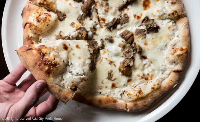 นอกจากพาสต้าเส้นโฮมเมดกับรีซอตโต้ที่เราชอบมาก ๆ แล้ว ไฮไลต์อีกอย่างหนึ่งของที่นี่คือครัวเปิดที่เราสามารถมองเข้าไปเห็นเชฟจูเลียโนง่วนอยู่งานครัวและอบพิซซ่าอยู่ด้านใน ซึ่งรอบนี้เราเลือกสั่งเป็น Pizza Tartufata (690 บาท) เมนูแนะนำจากเชฟจูเลียโนที่ประกอบด้วยวัตถุดิบหลักอย่างมาสคาโปเนชีส จากแคว้นลอมบาร์ดี อาสิกาโกชีส ชีสท้องถิ่นจากเขตเทรนทิโน่ เห็ดพอร์ชินีสดที่หาได้เฉพาะบนเทือกเขาแถบอิตาลี และปิดท้ายด้วยกลิ่นหอมอันเป็นเอกลักษณ์จากเห็ดทรัฟเฟิลดำ