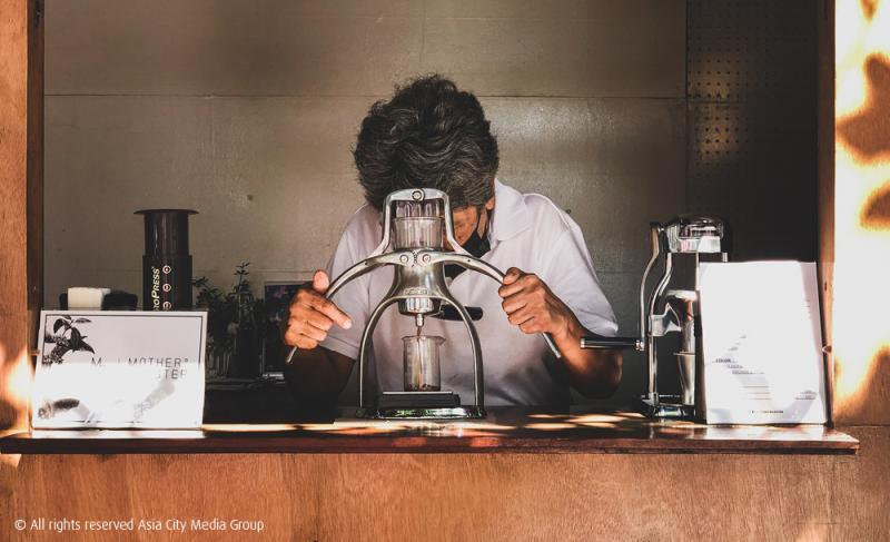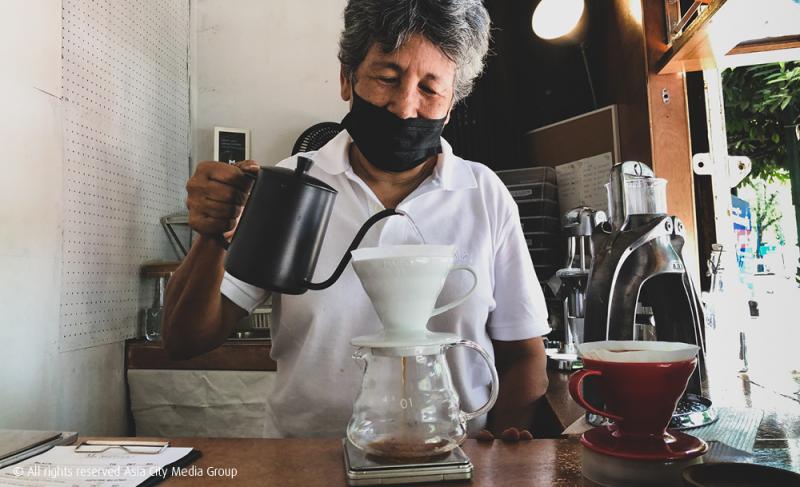 "รอก่อนนะ กาแฟใจเย็น" นี่คือประโยคที่ใครไปเยือนจะต้องคุ้นหูเพราะคุณป้า (หรือหลาย ๆ คนอาจจะเรียกว่าคุณแม่) เจ้าของร้านสุดเก๋าวัย 70 ปีที่ยืนหนึ่งทำทุกกระบวนการ บอกกับลูกค้าทุกคน ก็ทุกขั้นตอนตั้งแต่บดเมล็ดยันกดช็อตเอสเพรสโซ คุณป้าใช้เครื่องมือแบบ Manual ทั้งหมด (ก็เลยต้องรอนิดนึงน้าาา) ซึ่งแขกไปใครมาที่นี่เป็นต้องได้ภาพคุณป้ากับเจ้าเครื่อง Rok Presso ไปอวดลงโซเชียลมีเดียกันรัว ๆ