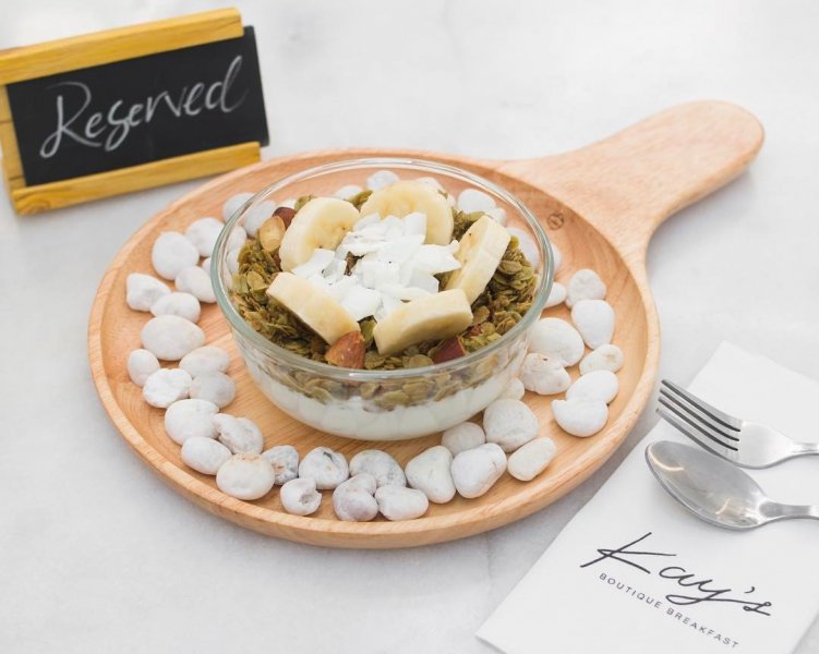 Kay’s Boutique Breakfast ก็เป็นอีกร้านที่เราชอบแวะไปเพราะมีทั้งเมนูเครื่องดื่มและอาหารใหม่ๆ ออกมาให้ลองอย่างสม่ำเสมอ อย่าง Matcha Granola Bowl (160 บาท) ก็เป็นอีกเมนูบรันช์ใหม่ที่น่าสนใจ กราโนล่ามัทฉะคลุกเคล้ากับโยเกิร์ต ท็อปด้วยกล้วยฝานพอดีคำ อย่าลืมสั่งมัทฉะลาเต้ของขึ้นชื่อของทางร้านมาดื่มคู่กันด้วยล่ะ