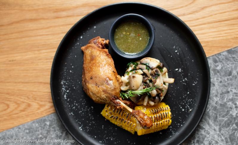 Duck Confit with Mashed Potatoes (285 บาท) เป็ดส่วนสะโพกนำไปตุ๋นสไตล์ฝรั่งเศสนานถึง 2 วัน จากนั้นนำไปอบแล้วทอด กินคู่กับมันบดหยาบ และเห็ดผัดกระเทียม ที่เลือกใช้เห็ดแชมปิญองกับชิเมจิ ผัดกับกระเทียมและพาสลีย์ โรยด้วยผงทงคาราชิ และพริกเพิ่มรสชาติเล็กน้อย จิ้มกับน้ำจิ้มซีฟู้ดแซ่บ ๆ แป๊บเดียวก็หมดจานแล้ว