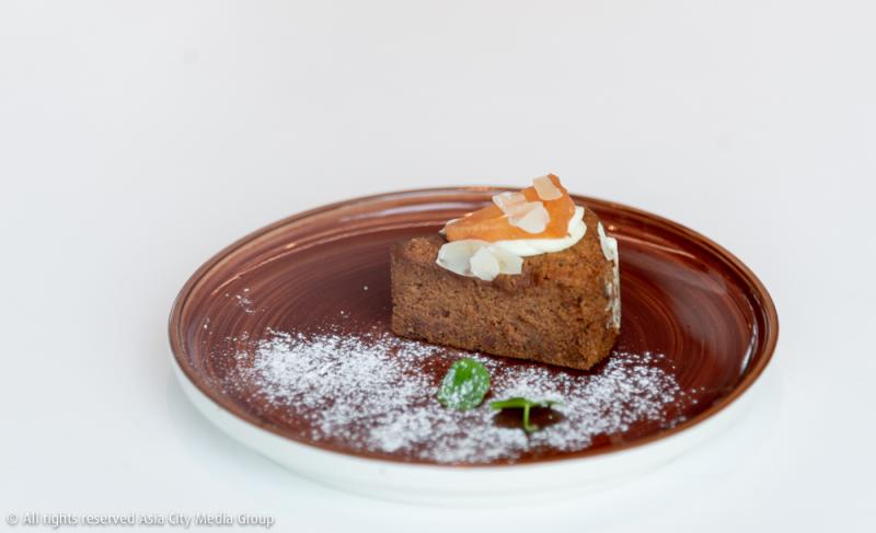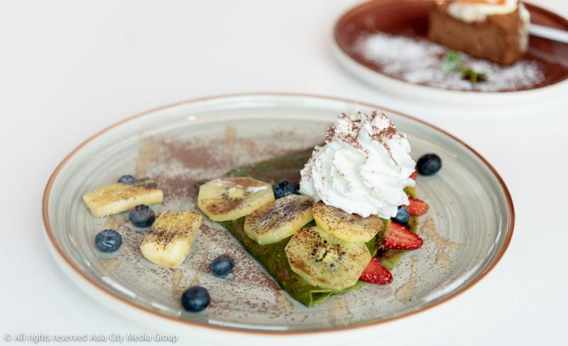 มาดูที่ขนมกันบ้าง พี่มาศก็เป็นคนทำเองหมดเลยเช่นกันและของหวานที่นี่ก็ไม่ได้ด้อยไปกว่าเครื่องดื่มเลย เริ่มที่เมนูแรกสำหรับคนรักสุขภาพ เค้กมะตูม (100 บาท) ที่ไม่มีการใช้แป้ง เป็น Flourless Cake ทำจากอัลมอนด์พาวเดอร์ผสมกับแครอท และยังมีเครปชาเขียวที่ทำจากแป้งฝรั่งเศส Matcha Crepe (150 บาท) เสิร์ฟพร้อมผลไม้หลากหลายชนิดพร้อมกับวิปครีมที่ตีครีมขึ้นมาเอง รสชาติออกมากำลังดี ไม่หวานมากจนเกินไป ทำให้ทานง่ายและทานได้เรื่อย ๆ ไม่เลี่ยน