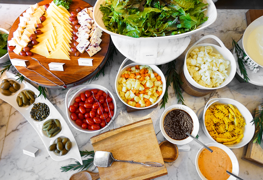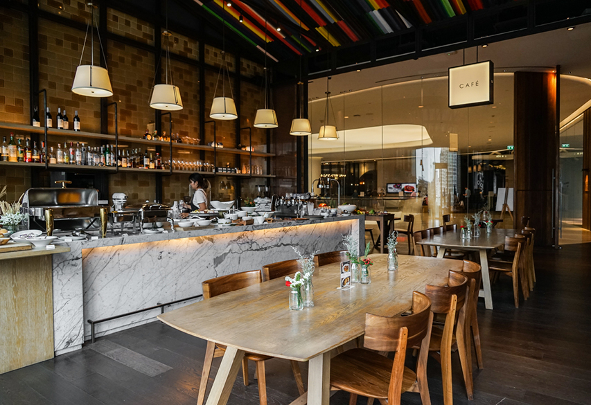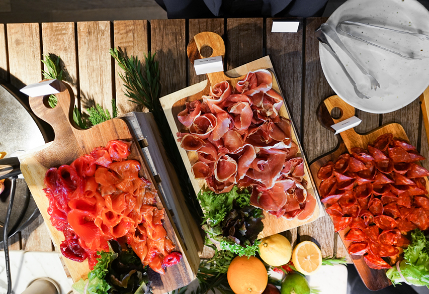 มื้อบรันช์ของที่นี่เริ่มตั้งแต่ 11:00-15:00 น. มีทั้งไลน์บุฟเฟ่ต์ตั้งแต่ขนมปังร้อน ๆ หลายแบบ กับ Cold Cuts ที่มีทั้งแฮม Jamon Serrano ไส้กรอกโชริโซ่รสเข้มข้น ไส้กรอกสไตล์อิตาเลียน Mortadella และแซลมอนหมักทานคู่กับเคเปอร์ส (Cured Salmon) ตักกันไปทานไม่อั้นกับชีสที่เลือกได้ทั้งบรีชีส เชดด้าชีสและ Wensleydale ชีสที่ใส่แครนเบอร์รี่ผสมมาด้วย