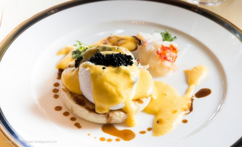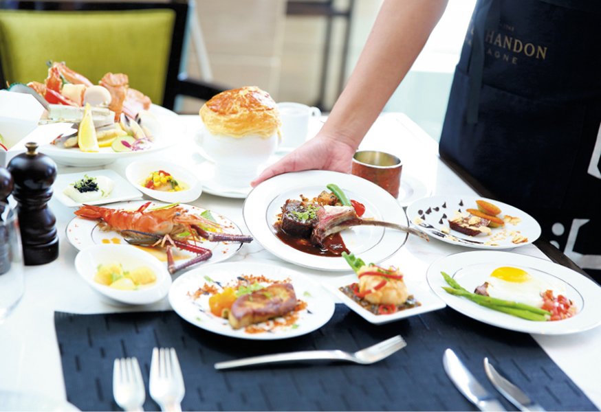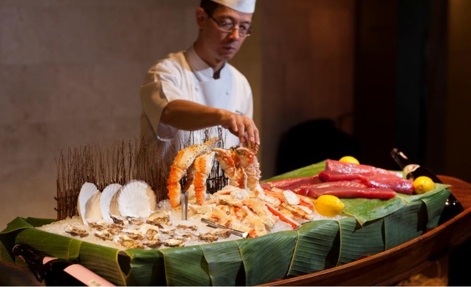 ตรงบริเวณล็อบบี้ของโรงแรมมีบริการบุฟเฟต์แบ่งออกเป็น 5 โซน ได้แก่ อาหารทะเล อาหารจีน (มีเป็ดปักกิ่งด้วย!) สลัด พาสต้า และของหวาน ส่วนอาหารจานหลักจะต้องสั่งแบบ a la carte แต่อย่าได้น้อยใจไป เพราะในเมนูมีทั้งล็อปสเตอร์เอ้กเบเนดิกต์กับครีมผักโขม, champagne sabayon and caviar และเบอร์เกอร์เนื้อวากิวกับฟัวกราส์ที่นำมาบริการเสิร์ฟให้ถึงที่ แต่เด็ดสุดคือเมนูหอยนางรมนั่นเอง