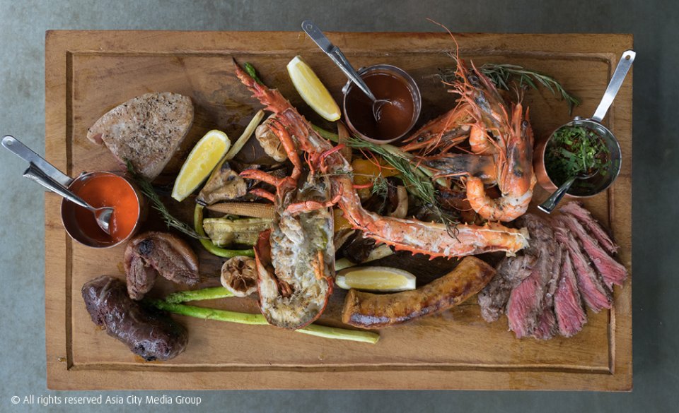 ลองสั่งเมนูพอร์ชันใหญ่สำหรับแชร์กับเพื่อนอย่าง Plancha Platter ชุด Mousse (ราคา 2,900 บาท) ประกอบด้วย Maine lobster ครึ่งตัว ขาปูอลาสก้าเนื้อแน่นๆ 1 ส่วน กุ้งแม่น้ำ 4 ตัว ไส้กรอกเลือด สเต็กทูน่า เนื้อย่าง เนื้อแกะส่วน shortloin ไส้อั่วจากเชียงใหม่ เสิร์ฟพร้อมบรรดาซอสกับผักย่าง