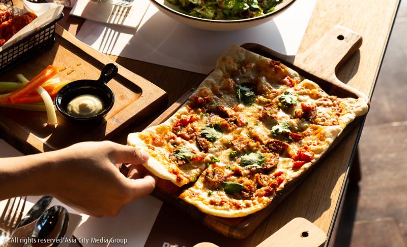 แต่สำหรับสายกินที่กำลังมองหาบรันช์แบบหนักท้อง เราแนะนำให้สั่งพิซซ่าสูตรพิเศษของทางร้านอย่าง Lanna (360 บาท) ที่เราสั่งมาแบบไซซ์ Sharing เลยออกมาจานใหญ่อย่างที่เห็น ส่วนใครที่มาคนเดียวก็สามารถสั่งไซซ์เล็กได้เหมือนกันนะ ซึ่งความพิเศษของเจ้าพิซซ่าตัวนี้ นอกจากจะมาในทรงสี่เหลี่ยมแปลกตาแล้ว รสชาติยังจัดจ้านถูกปากคนไทยด้วยการท็อปปิ้งหน้าพิซซ่าด้วยไส้อั่วและน้ำพริกอ่อง จะเรียกว่าเป็นเปปเปอโรนีพิซซ่าแบบไทยสไตล์ก็ไม่ผิดนัก