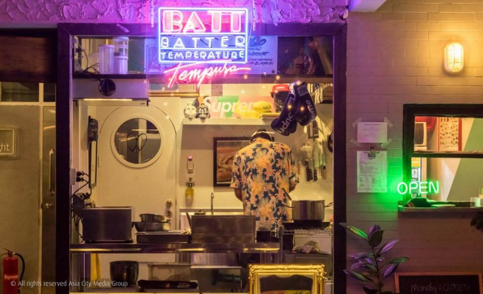 Batt Tempura ร้านเทมปุระแห่งใหม่ในซอยเอกมัยที่เพิ่งเปิดเมื่อเดือน ก.พ. ที่ผ่านมา จะทำให้เราลืมหน้าตาของร้านเทมปุระแบบเดิมๆ ไปได้เลย ด้วยบรรยากาศสบายๆ ที่มาพร้อมกับการตกแต่งแบบ eclectic ป้ายไฟนีออนสไตล์ยุค 80's และทุกอย่างจากแบรนด์ Supreme