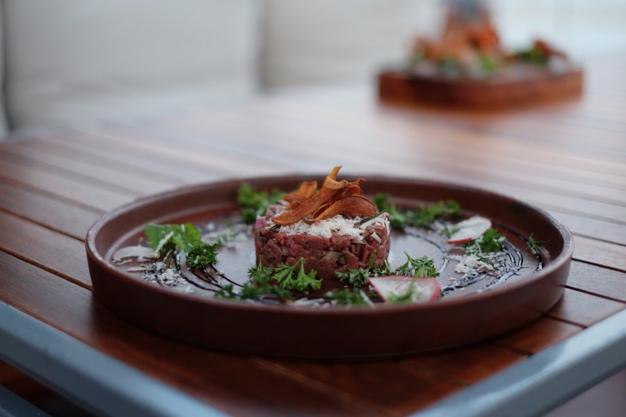 แม้จะเป็นห้องอาหารริมทะเลที่มีวิวทะเลหลักล้าน ก็ไม่ได้มีแค่เมนูซีฟู้ดเสมอไป แต่เมนูเนื้อเด็ด ๆ ก็มีให้ลองเช่นกัน อย่างทาทาร์เนื้อ (380 บาท) ที่นำเนื้อสับมาคลุกเคล้ากับพาร์เมซานชีส ปรุงรสด้วยน้ำส้มสายชูบัลซามิกกับใบโหระพา จานนี้เราชอบรสชาติเป็นพิเศษ บัลซามิกที่เคลือบเนื้อสับมาทำให้เนื้อนชุ่มฉ่ำขึ้นจนเราเผลอกินหมดจานในเวลาแป๊บเดียว