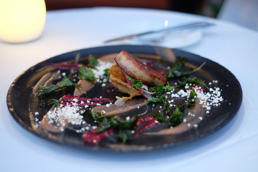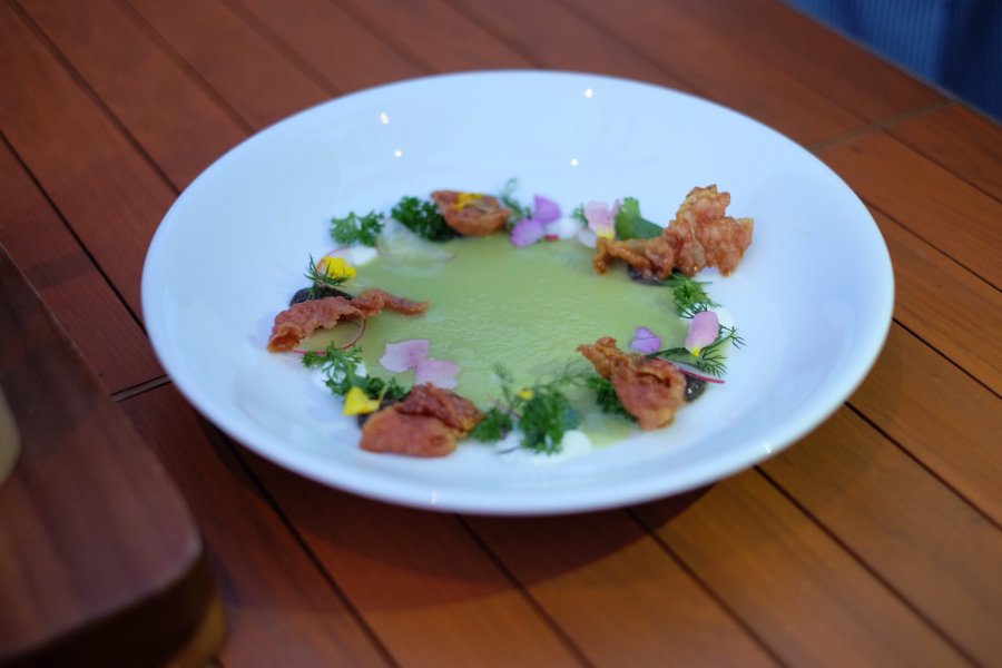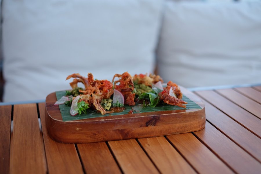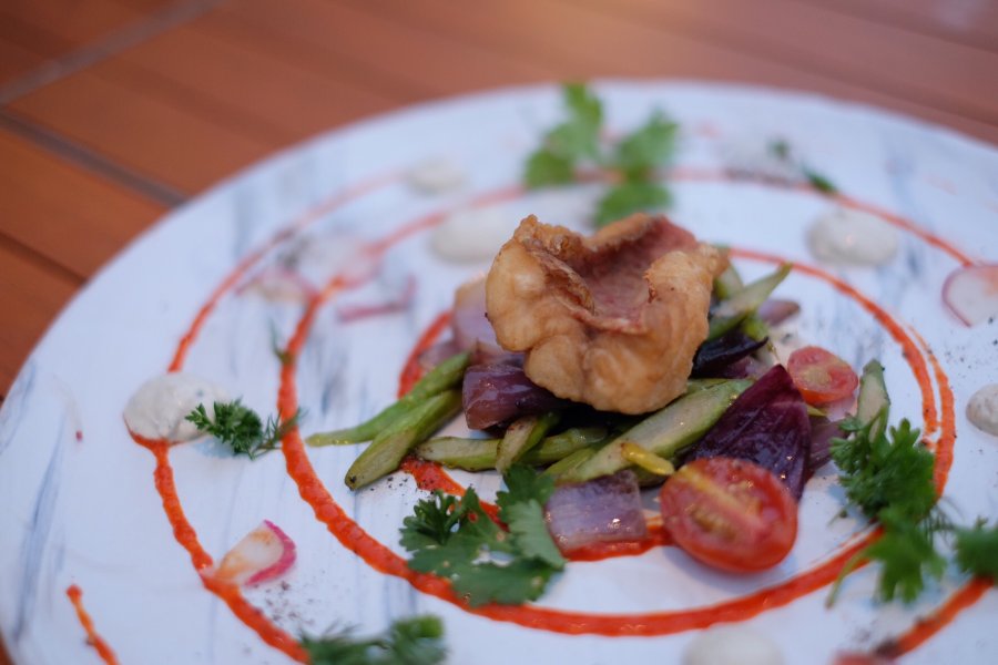 นอกจากนี้ยังมีเมนูอินเตอร์แต่ผสมความเป็นไทยเข้าไปด้วยอย่างหอยเชลล์ยูเอสตัวโต กินคู่กับลิ้นจี่ซัลซา ไข่ปลาแซลมอน และมะม่วงพูเร (400 บาท) ตับห่านกริลล์กำลังนุ่ม ที่โรยมาด้วยใบกะเพราทอดกรอบ และซอสสูตรพิเศษ (500 บาท) หรือชอบรสจัดจ้านแบบไทย ๆ ก็ขอให้ลองเมนูปูนิ่ม (500 บาท) ที่มาพร้อมซอสสามรสที่เราคิดว่ารสชาติมันเหมือนน้ำจิ้มไก่ไปหน่อย แต่อย่างไรก็น่าจะถูกปากคนไทยแน่นอน