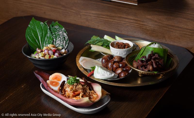 อาหารไทยสไตล์ภาคตะวันออกที่มีเบสหลักอยู่ที่จังหวัดตราด จันทบุรี ไล่เลยไปจนถึงกลิ่นอายจากภาคอีสาน ถูกนำมาวางเสิร์ฟให้เราได้ชิมกันในค่ำคืนนี้ ได้แก่ สำรับทานเล่น (350 บาท) เมนูออร์เดิร์ฟสไตล์ภาพตะวันออกที่ประกอบด้วยเนื้อแดดเดียวทอด ไส้กรอกอีสานจากอุบลราชธานี ข้าวเหนียว และน้ำพริกหมูชะมวงผักสดที่เป็นเมนูขายดีมาจากร้านศรีตราด ซึ่งถ้าใครกลัวไม่อิ่ม ก็สามารถสั่ง ยำหัวปลีกุ้งสด (220 บาท) มาเป็นออร์เดิร์ฟด้วยได้เหมือนกัน ที่นี่เขาใช้หัวปลีกรอบ ๆ มายำพร้อมกุ้งสดตัวใหญ่ ๆ หอมเจียว พริกแห้ง ไข่ต้ม และปรุงรสด้วยน้ำมะขามที่ทำให้รสชาติของยำหัวปลีจานนี้โดดเด้งขึ้นมาจากจานอื่น ๆ
